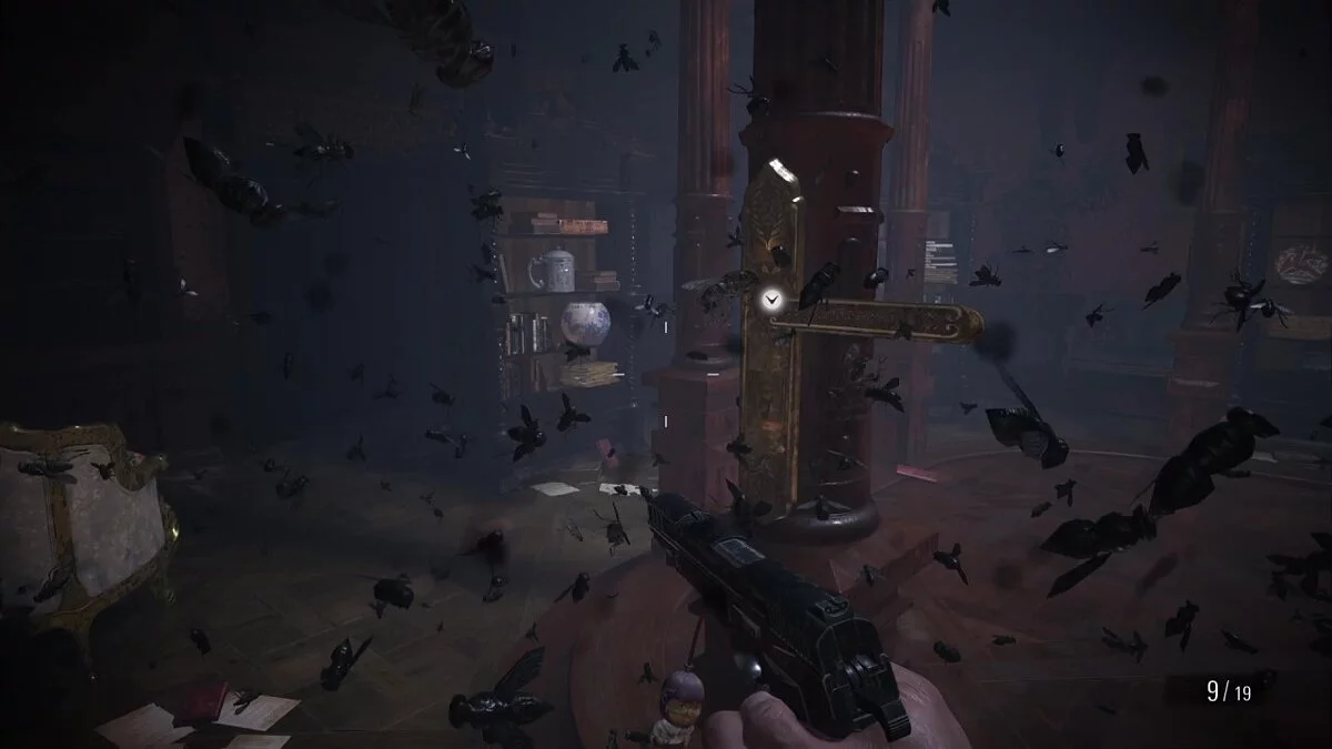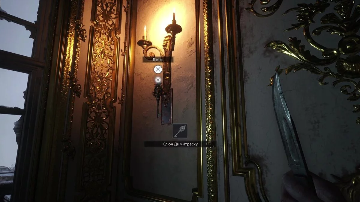 В награду получите железный ключ с отметкой. Им можно открывать двери со знаком. Возвращайтесь обратно на второй этаж, но по пути вам встретится Димитреску. Придется снова бежать вниз и выходить через оперный зал на первом этаже. Снова поднимайтесь на второй этаж и открывайте дверь в библиотеку.