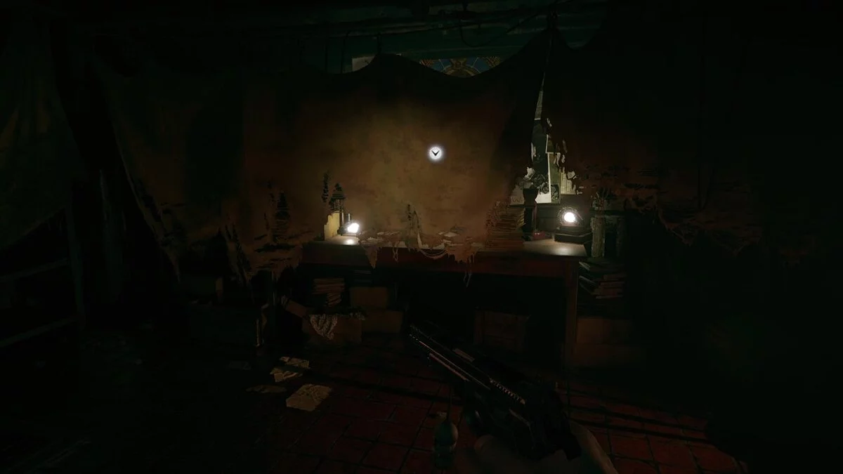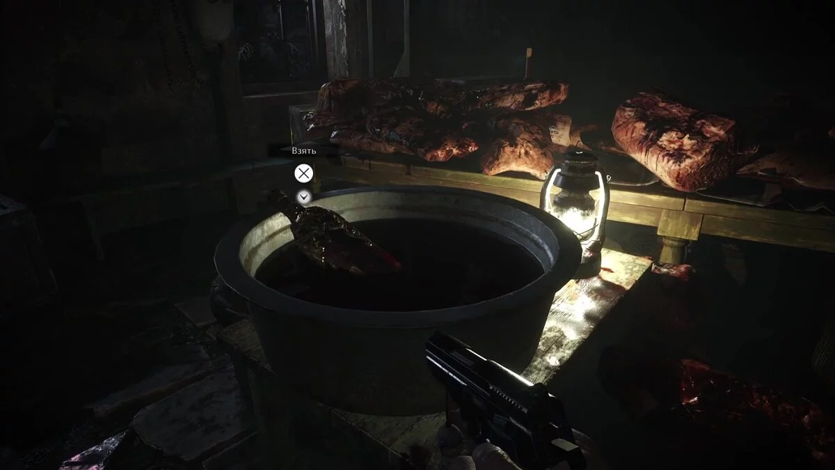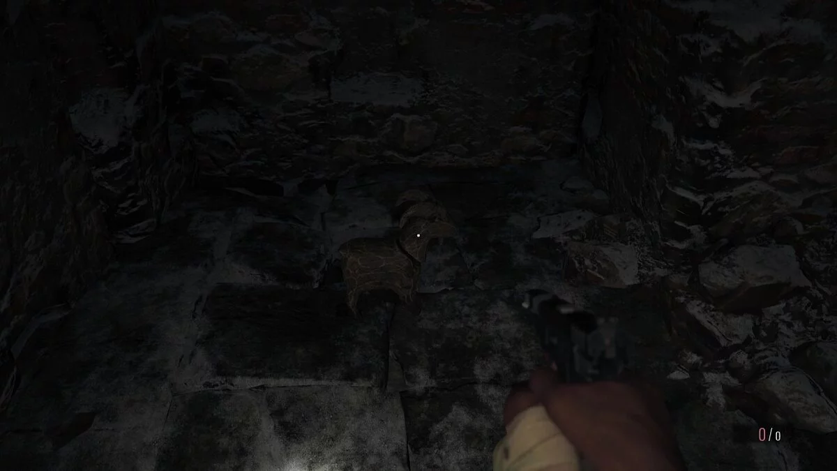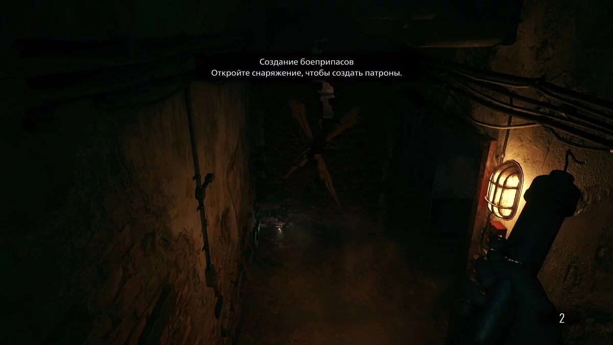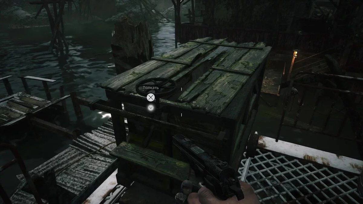 После этого кровь из ванны уйдет, и откроется проход вниз. Как только вы окажетесь в подземелье, уничтожьте козий оберег. Далее вам предстоит пройти полузатопленные помещения. Подберите ржавые обломки с заваленного стеллажа. Обойдите его, разбейте ящик и заберите монеты. Опасайтесь зомби, которые лежат под водой. Присматривайтесь к водной глади, следите за рябью. Сложного здесь ничего нет, а путь только один. Далее будет место, где можно забаррикадироваться. На столике со свечами вы найдете патроны. Пройдите дальше, разбейте ящик и заберите патроны. По пути загляните под стеллажи с бочками (с арками), чтобы найти обломки. Впереди за ящиками подберите порох. Также на деревянном стеллаже разбейте ящик и заберите патроны. В итоге вы выйдете к лифту. Разбейте ящик, забирайте патроны, далее дергайте за рычаг и поднимайтесь.