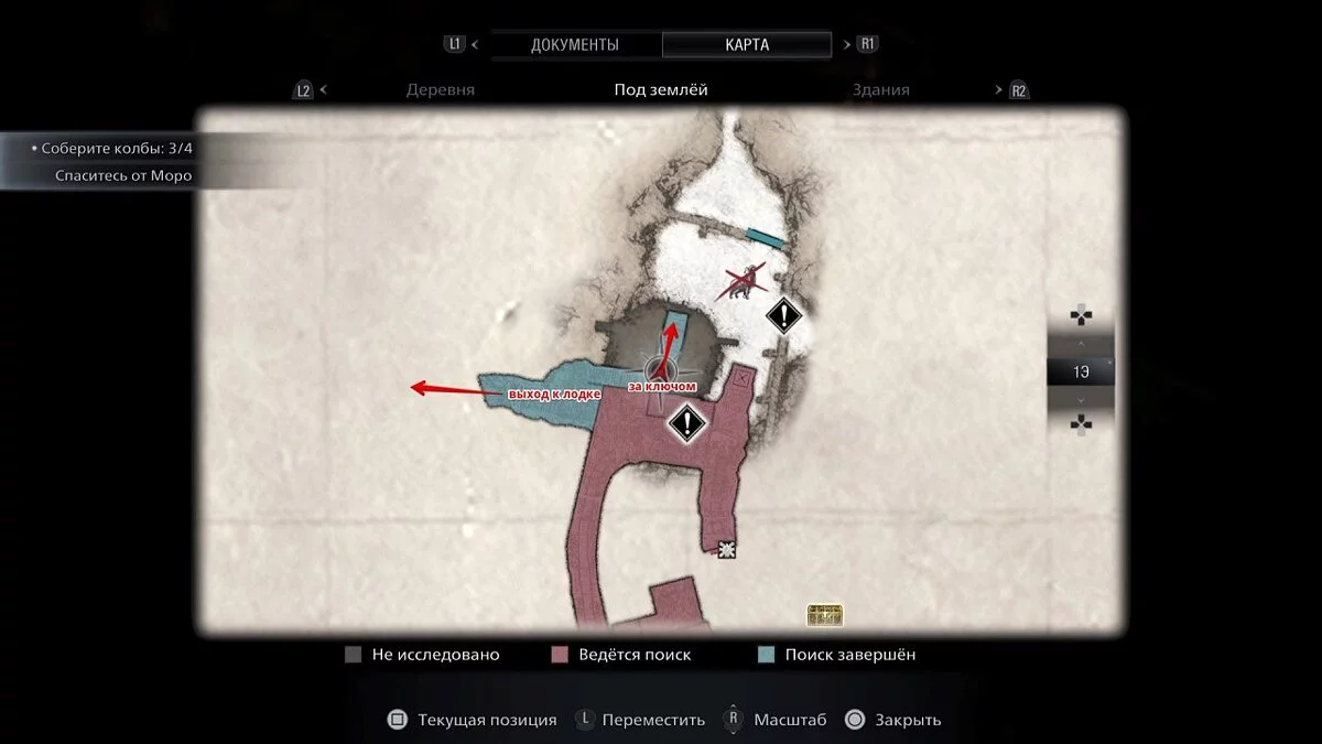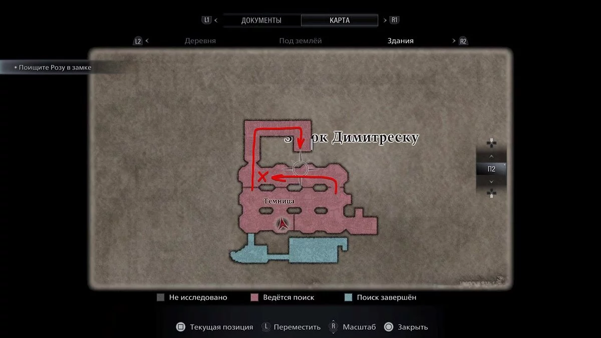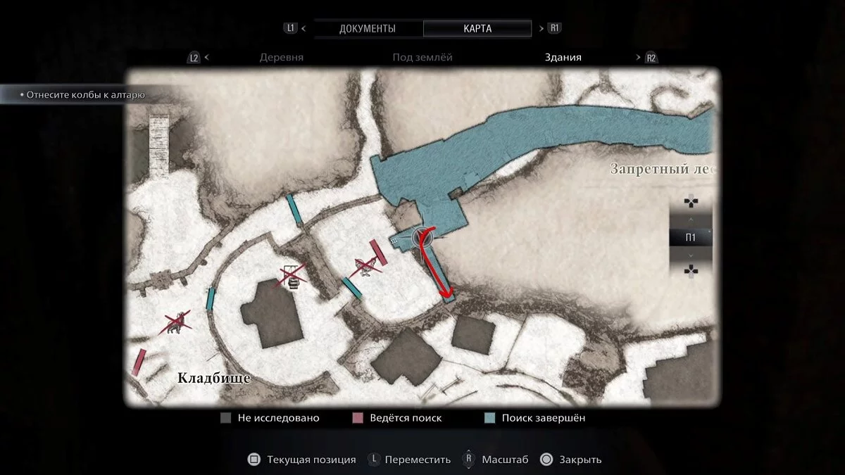 Когда доплывете до очередных катакомб, не поднимайтесь по лестнице. Сверните влево. Вы попадете в темницы, где найдете документ об Альсине Димитреску, фото неуловимой рыбы, реагент, бомбу, патроны. Далее вылезайте по лестнице на поверхность. Вы окажетесь в склепе рядом с церковью.