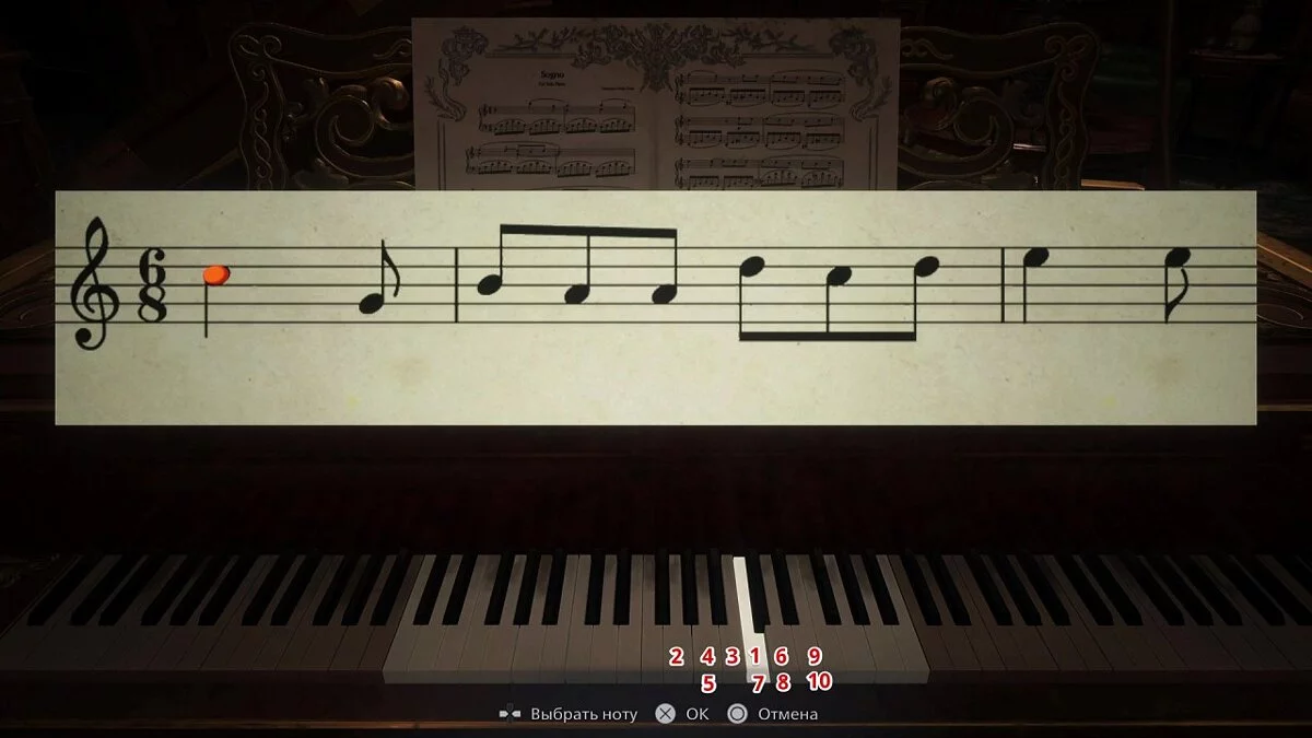 Загадка с роялем. Нужно сыграть мелодию по нотам. Даже если вы ничего не понимаете в музыке, то сможете подобрать нужные клавиши методом тыка. Но мы указали правильную последовательность на скриншоте.