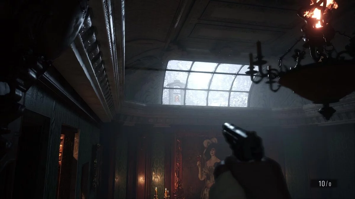 Вы окажетесь в просторном зале с картиной. Осмотритесь: соберите монеты в вазе слева, прочитайте документ на столе. Обратите внимание, что стеклянные дверцы у мебели можно разбивать. Разбейте шкафчик в этой комнате, чтобы найти порох. В соседней комнате с лифтом подберите 500 монет. На одной из стен будет обломок кристалла. Далее идите единственным путем через коридор. Разбейте вазу и шкаф, чтобы найти порох и патроны. Далее вы выйдете в зал с лестницей. Подойдите к двери с табличкой, чтобы перейти к катсцене.
