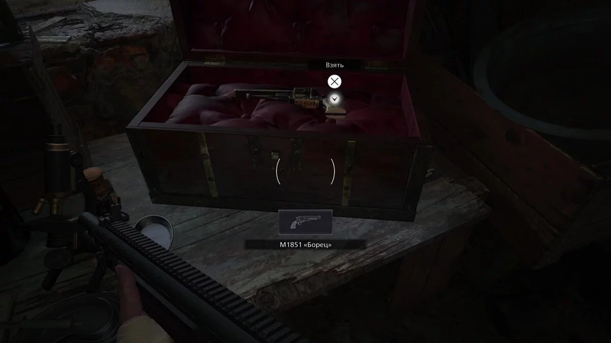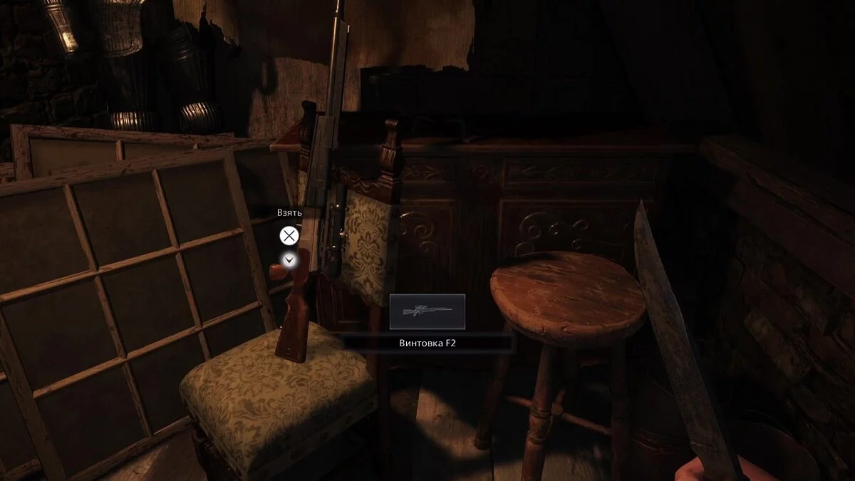 Откроется потайная дверь. Слева подберите зеленую траву и идите по единственному пути, пока не выйдете на чердак. Сбейте козий оберег на ящиках сразу после подъема по приставной лестнице. Также найдите здесь отмычку, документ, карту сокровищ, порох и монеты. И наконец, в дальнем конце чердака заберите винтовку F2. Выходите на крышу через окно.