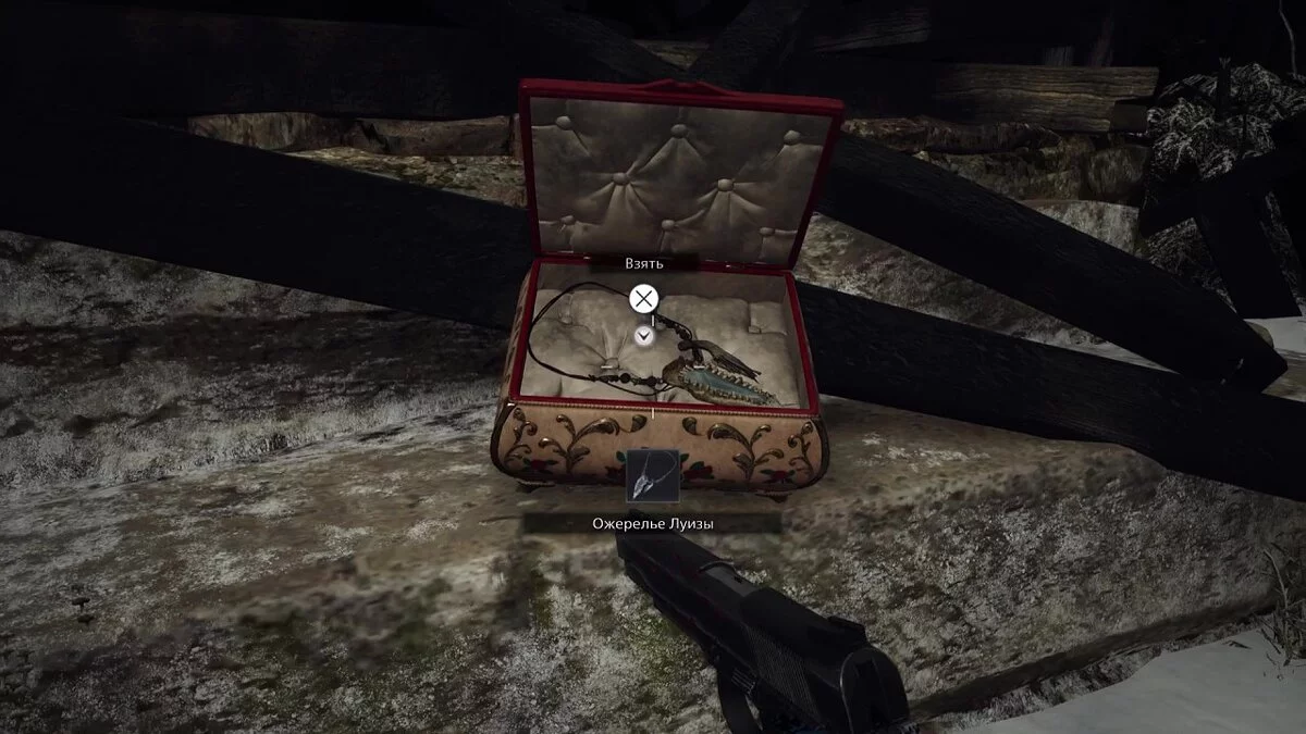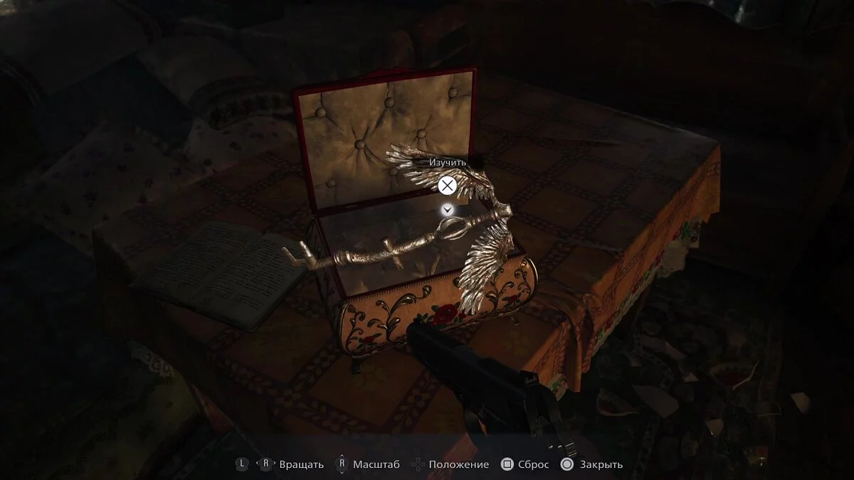Через главный холл идите в зал наслаждений, что в южной части второго этажа. Открыть дверь можно при помощи найденного ключа Димитреску. В ящике комода вы найдете составное сокровище серебряное кольцо, а в вазе патроны. Сбейте также обломок кристалла с потолка. Далее заберите маску наслаждений со статуи и полезайте через камин в соседнее помещение.
