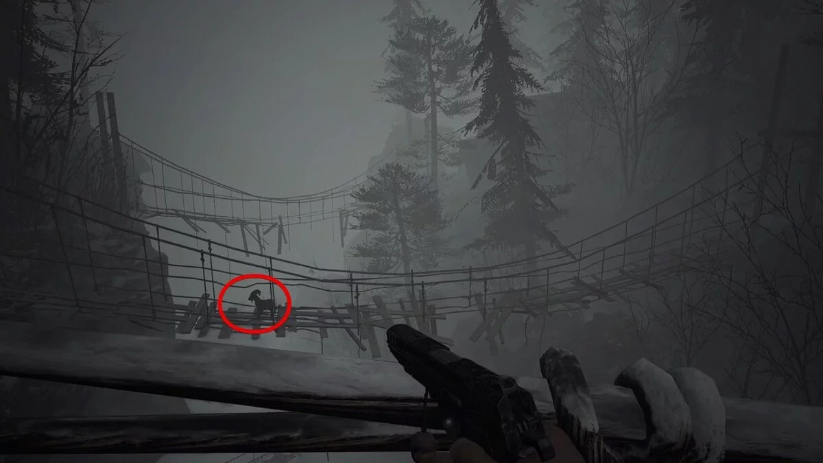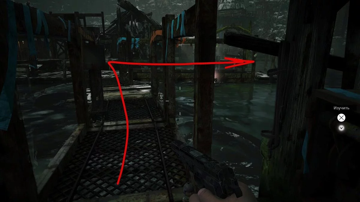 Также здесь можно найти козий оберег. Стоя на площадке с тремя цветными переключателями, посмотрите на север. Посреди болота на одном из торчащих бревен будет козий оберег. Также здесь на столе лежат патроны для револьвера.