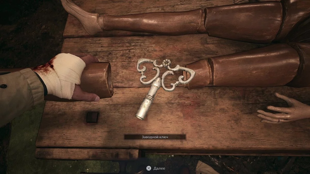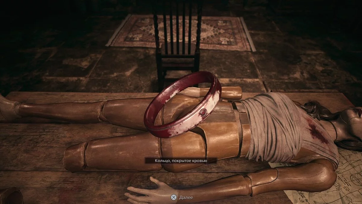 Разбейте второе окно и подберите патроны с полки. Идите дальше, вы попадете на кухню. В тазике заберите ту самую бутылку «Кровь девственницы», которую унесла Димитреску. Также прочитайте записку о несчастной служанке на стеллаже и заберите обломки. Выходите в коридор, по правой стороне будет комод с простым замком (отмычка). Также осмотрите чемоданчик неподалеку, там находится дульный тормоз (LEMI). Кроме того, далее по коридору найдете отмычку. Можно как раз вернуться назад и открыть ящик. В нем будет лежать сокровище деревянная статуя ангела (3000).