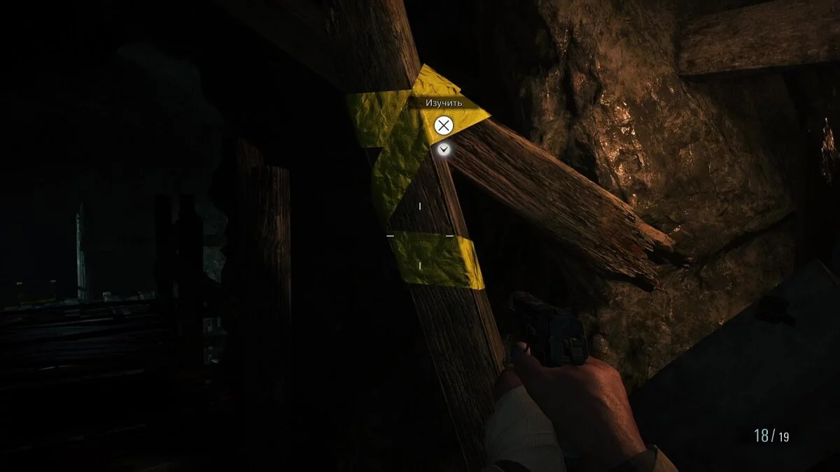 Идите вглубь шахты по пути подберите патроны. Ломайте доски, перевязанные желтой лентой. Это разрушаемый объект и в дальнейшем он встретится не раз. Спуститесь по лестнице и зайдите за нее, чтобы разбить бочку с монетами. Затем вы выйдете в пещеру, в середине которой растет дерево и стоит та самая бытовка. Разберитесь с оборотнями и обыщите локацию. Противников здесь довольно много, поэтому можно забаррикадироваться в бытовке. Кроме того, будет и один с железными когтями, который появится когда вы возьмете ключ от лодки. Соберите припасы: в дальнем конце пещеры патроны в бочке, в лодке еще патроны, за бытовкой стоит бочка с монетами, в центре растет трава.