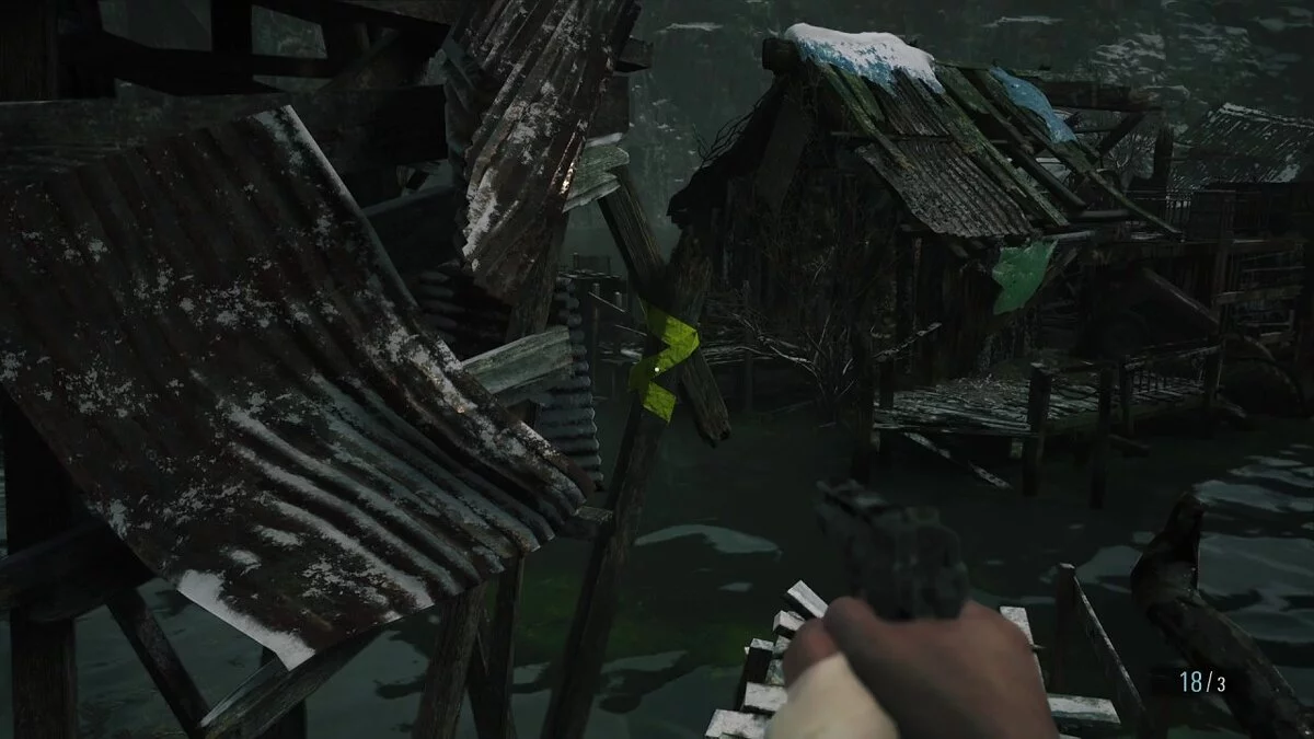 Очередная тропинка выведет Итана к деревне. Эту локацию по ходу сюжета придется посетить не раз, поэтому если вы что-то пропустите, то ничего страшного. Однако лучше сразу обшаривать каждый уголок, чтобы на карте остались пометки. Сейчас вы, например, не сможете открыть ящики с простым замком, так как нет отмычки. Но отметка останется и вы не забудете про это.