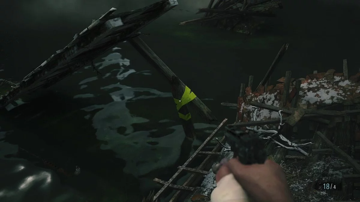 Перейдите на мельницу, заберите патроны по левой стороне и обойдите вокруг центральной части, чтобы найти козий оберег. Далее попробуйте крутить рукоятку. Как и было написано в записке, она сломается. Теперь придется искать другую. Зайдите внутрь мельницы и спуститесь по лестнице. Вы попадете в затопленную местность, где вам придется пробираться по обломкам до следующей мельницы. Сложного тут ничего нет, не попадайтесь в пасть морскому чудовищу и прокладывайте путь, стреляя в доски с желтой лентой.