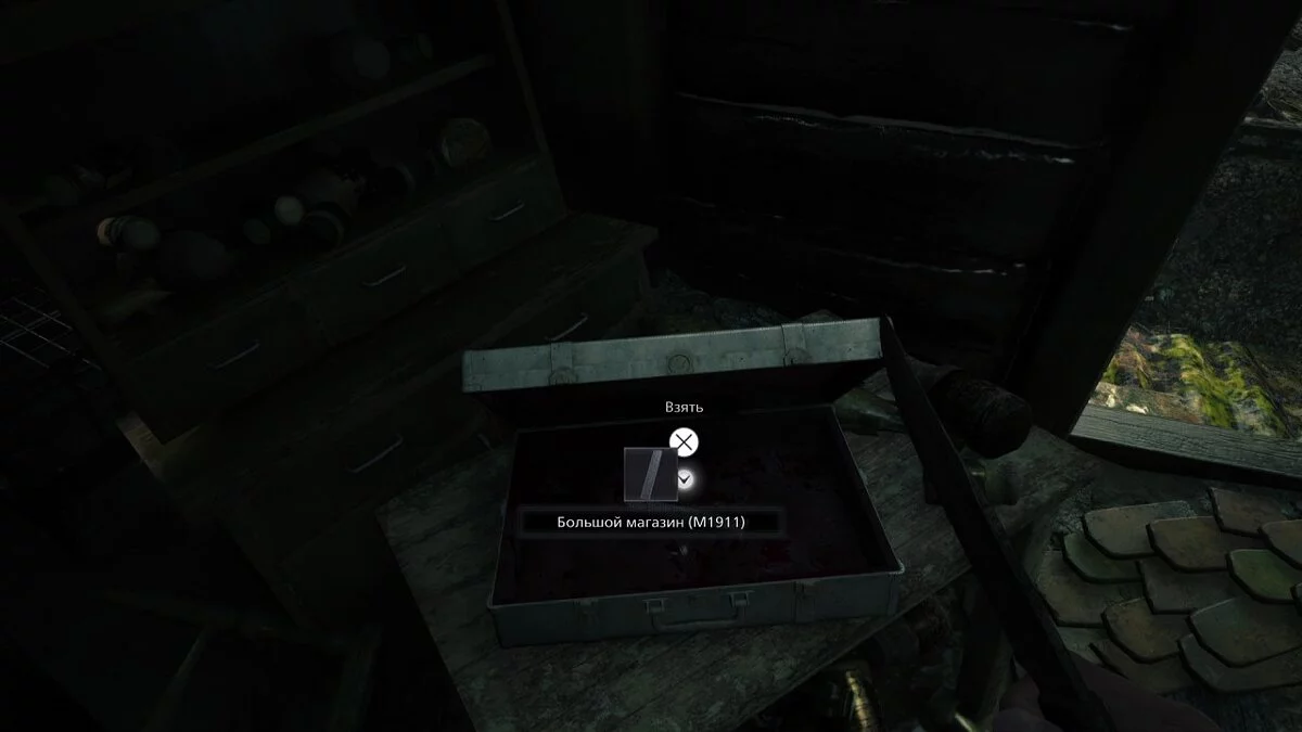 Активируйте шлюз и выходите. Теперь вода ушла и вы можете пройти дальше. В бочке найдете монеты, далее зайдите в дом, который мы отметили на карте. Там вы найдете большой магазин (M1911) и записку в ящике стола.