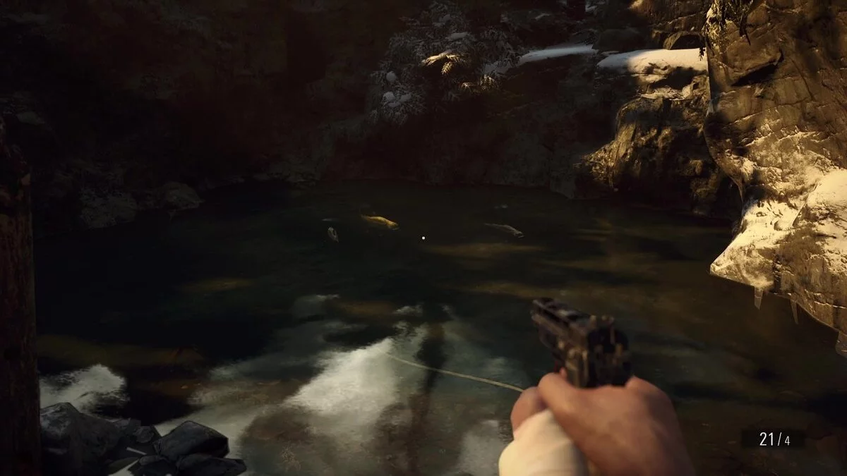 Сначала можно проплыть назад. Вы приплывете к небольшой области. Здесь можно настрелять рыбы. Причем одна из них будет уникальная. Вы получите ингредиент превосходная рыба. Также здесь можно найти пещеру. В ней есть снаряды, мины, сокровище древняя монета (8000) из дома Бейкеров, апгрейд для оружия цевье (W870 TAC), а также текстовый файл на ноутбуке.