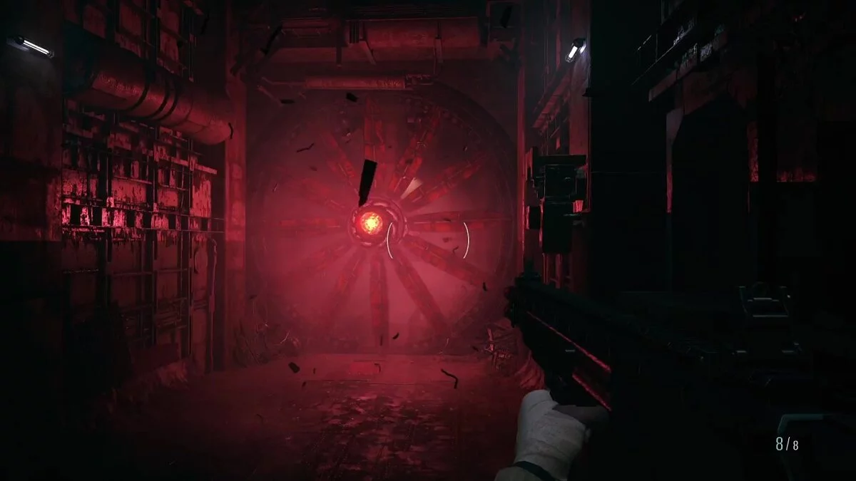 Теперь, когда у вас есть барельеф с лошадью, можно пройти через дверь южной части литейной. Вы выйдете на запертую дверь с символом (лощадь). Слева будет запертый стол, отоприте его и получите патроны револьвера. Далее спрыгивайте вниз и заберите патроны из ящика, что находится позади. Механизмы, мешающие пройти, можно вырубить. Стреляйте по красным лампочкам. Они не всегда расположены на видных местах, поэтому внимательно осматривайте механизмы. В середине платформы разбейте ящик с патронами, неподалеку за перилами лежат фугасные снаряды. Поднимайтесь по лестнице. В тупике справа от вентиляции подберите ржавые обломки. В итоге вы обойдете вокруг и откроете запертую дверь, чтобы снова оказаться в литейной.