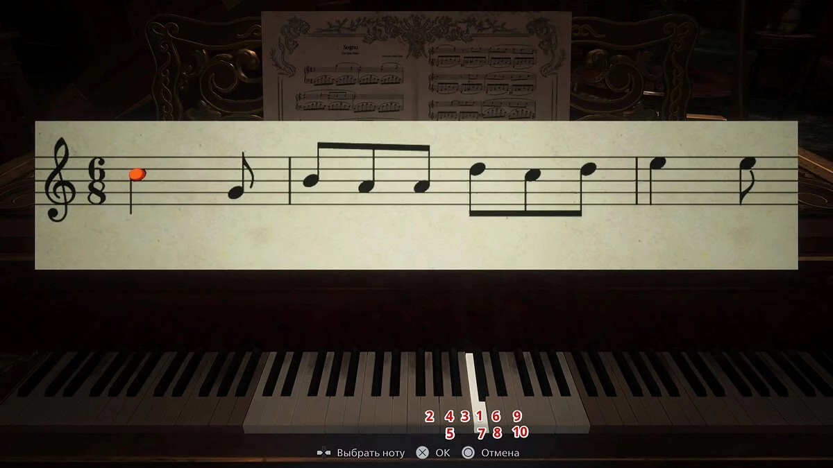 Нужно сыграть мелодию по нотам. Даже если вы ничего не понимаете в музыке, то сможете подобрать нужные клавиши методом тыка. Но мы указали правильную последовательность на скриншоте.