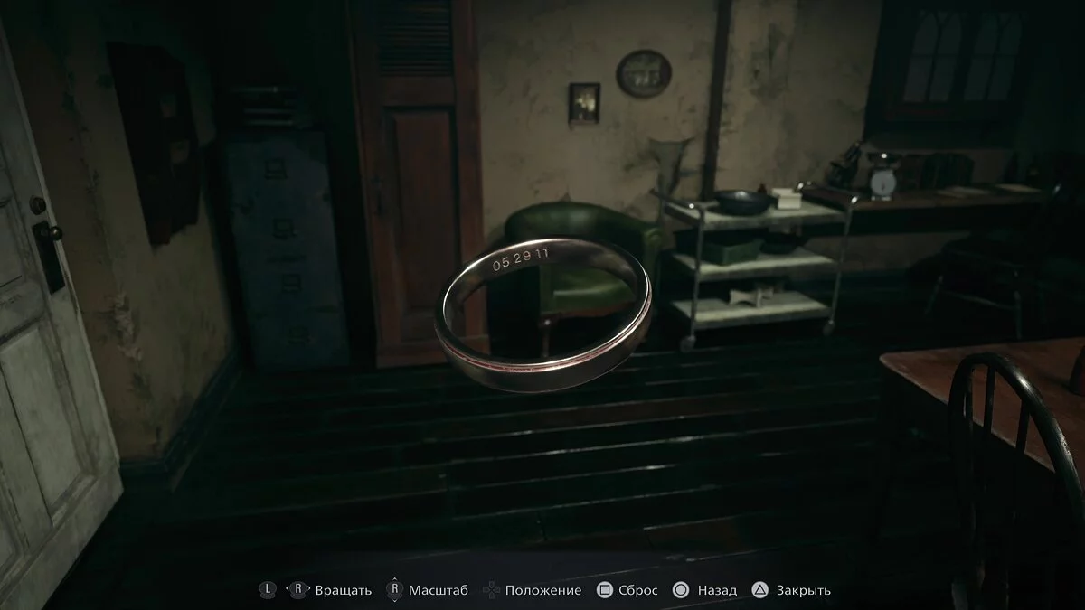 Откройте серебряным ключом дверь в соседнее помещение. Подойдите к раковине и промойте кольцо. Теперь его можно рассмотреть в инвентаре и разглядеть цифры: 05 29 11. Это код от замка, который висит на двери, что ведет к выходу.
