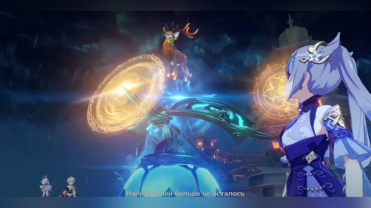 После победы над тремя формами Чайльда, смотрите продолжительный видеоролик с Архонтом Вихрей и Адептами. Здесь же появятся Фатуи, которые намерены сломать баллисту Гуй Чжун. Вам предстоит оборонять три части баллисты. В левой части экрана вы можете наблюдать состояние каждой из них: