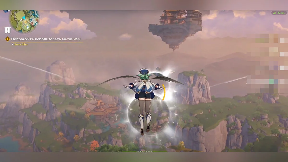 Добравшись до горы, вы увидите подсвеченную область, которую необходимо исследовать, чтобы попасть в парящий Нефритовый дворец. Осмотрите вершину холма и отыщите единственный ветряк, с которым можно взаимодействовать при помощи стихии «Анемо». Когда сделаете это, в небе перед дворцом появится воздушный поток и несколько колец. При помощи них доберитесь до небольшого острова, парящего в воздухе.