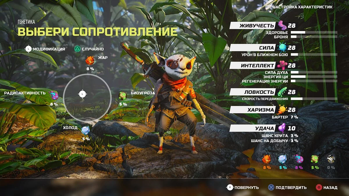 Есть возможность выбрать сопротивление. Всего четыре варианта — жар, радиоактивность, холод, биоугроза. В дальнейшем эти показатели можно будет прокачать.