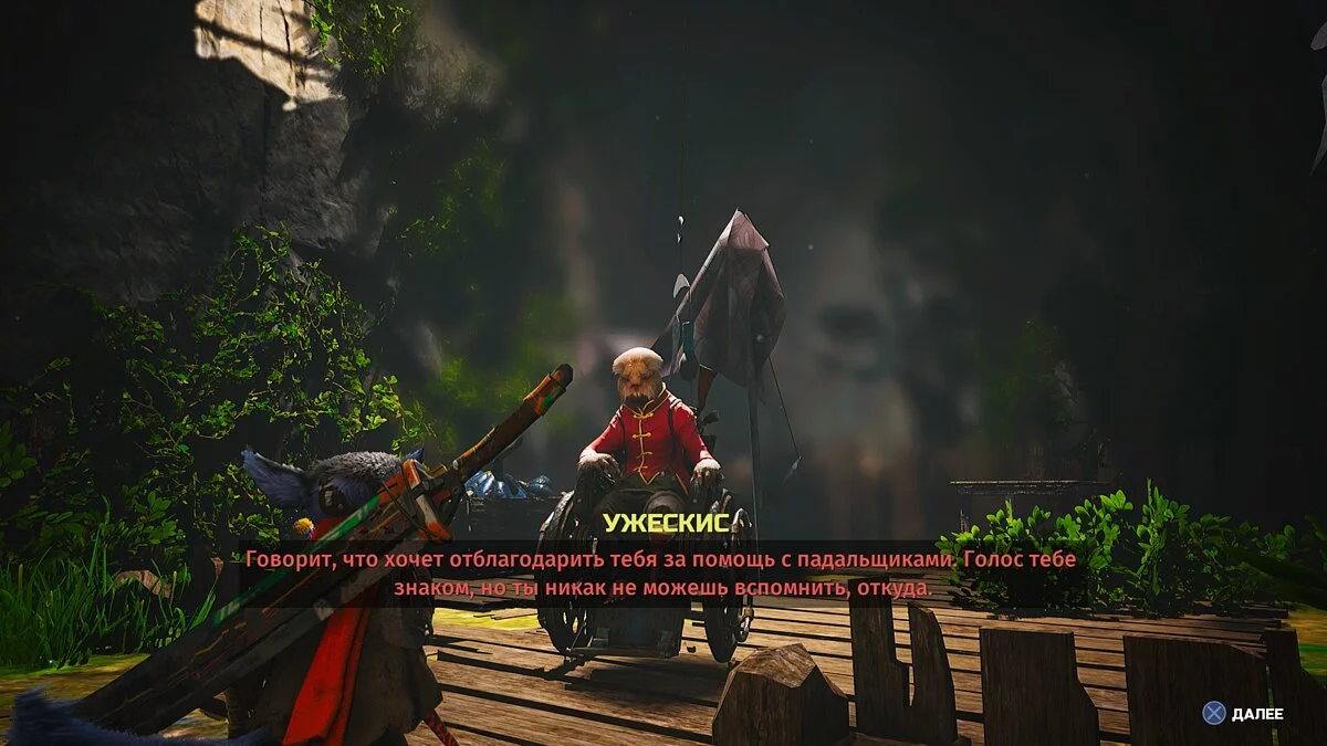 Помогите существу на инвалидной коляске отбиться от монстров и поговорите с ним после. Его зовут Ужескис, и он помнит героя с детства. После разговора с ним вы увидите флешбек.