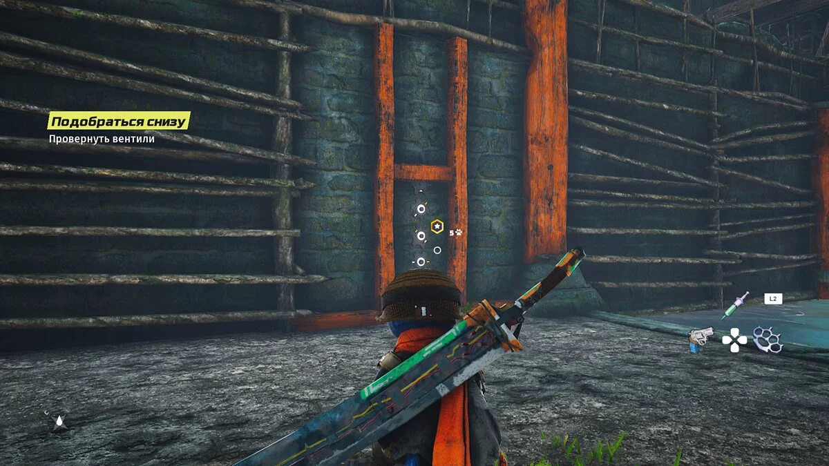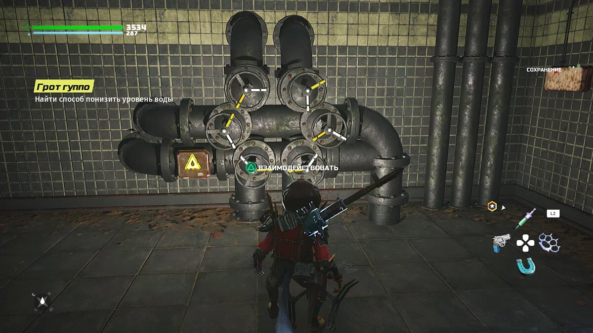 Направляйтесь в канализацию и пройдите по канату. Решите головоломку с соотношением цветов на вентилях — уровень воды понизится. Внизу вас ждет пара врагов. Далее необходимо разбить стену с помощью перчатки.