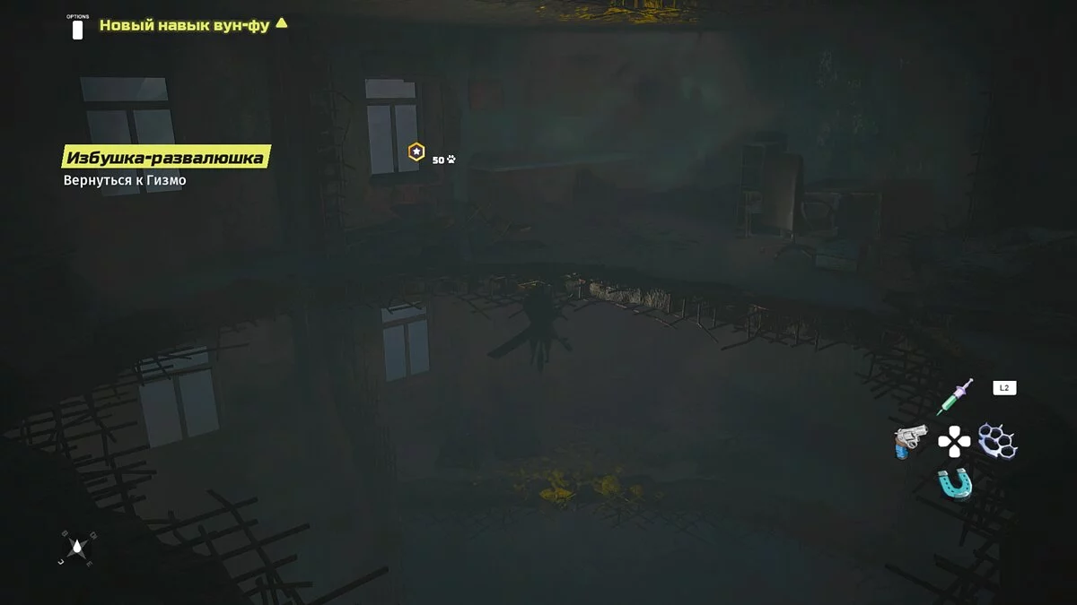 Забрав на фуре материал, скорее прыгайте по кускам асфальта к другому дому. Большой ящик в центре — то, что вам нужно. Забирайте все и возвращайтесь назад к Гизмо. Однако идти по тому же пути не получится. Забирайтесь на контейнер, а с него прыгайте на подсвеченный желтым кусок стены. Герой сможет уцепиться. Поднимайтесь на самый верх, а оттуда спускайтесь по канату к изобретателю.