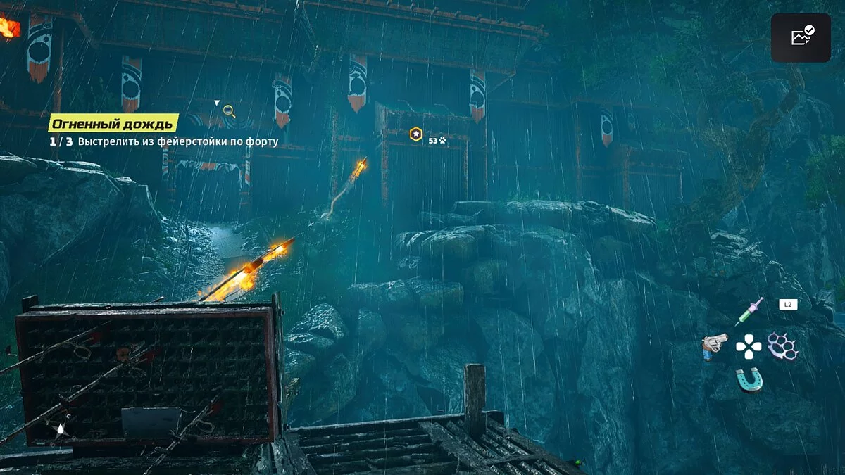 За воротами будет вторая партия слабых мобов. Разобравшись с ними, поднимайтесь на крышу со стойкой фейерверков. Направьте стойку в стену дворца и взорвите ее ракетами.