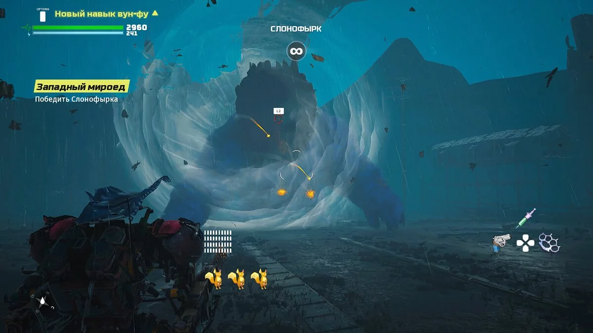Со своим первым боссом вы будете сражаться в роботе. Монстр не слишком силен, главное быть внимательным. Сначала мироед прыгнет, и от его лап к вам потянутся три линии огня. Держитесь между ними и стреляйте. В какой-то момент Слонофырк запрыгнет на корень и начнет швырять камни — уворачивайтесь. Сейчас ему нельзя причинить вред. Далее схема повторится.