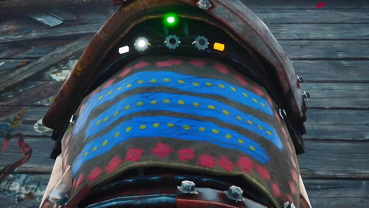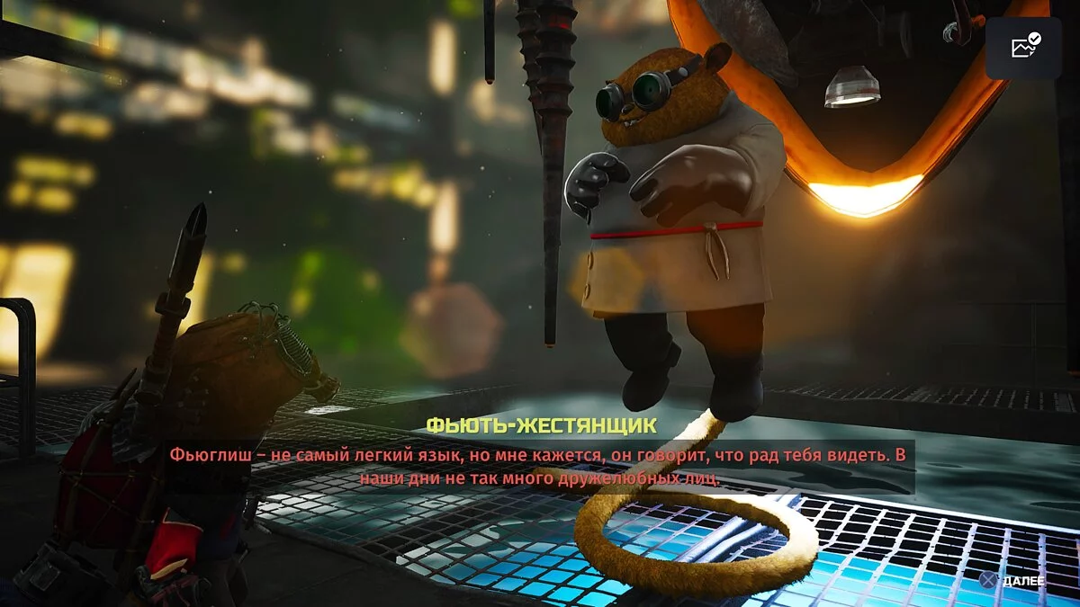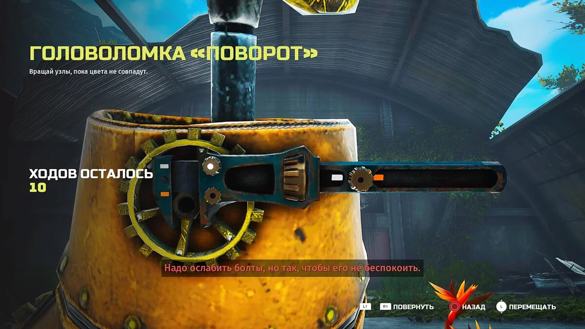Как и предыдущие соратники, Фьють попросит вас найти необходимую деталь для его устройства. В данном случае это гаечный ключ, чтобы открыть люк. Отправляйтесь на мехастадион, но дверь будет закрыта. Пройдите по лестнице, чтобы восстановить питание в щитке — поверните узлы, пока цвета не совпадут. За дверью вас будет ждать огромная механическая рука. Нужно ослабить болты, чтобы снять с нее гаечный ключ. Руку, кстати, можно потом использовать как транспорт.