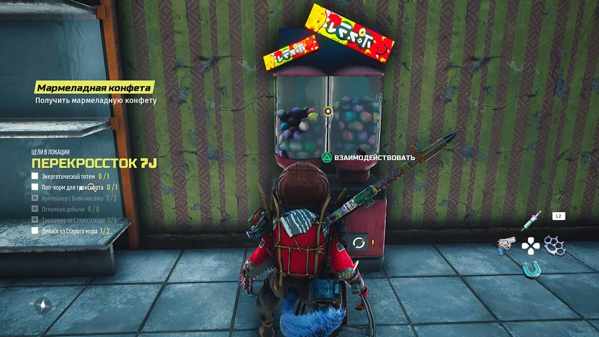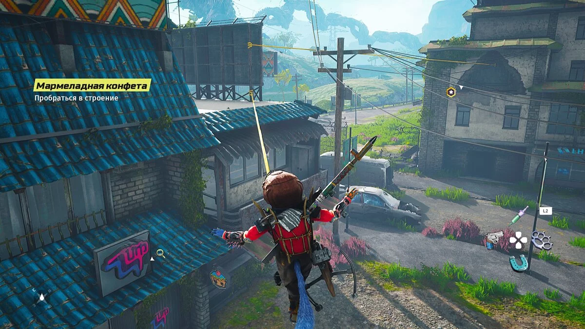 В зоне с конфетами очень много лута, можете все спокойно осмотреть. Однако сразу в нужный дом вы не попадете — придется пробираться по канатам. Игра сама подскажет дом, с которого необходимо начинать подъем.