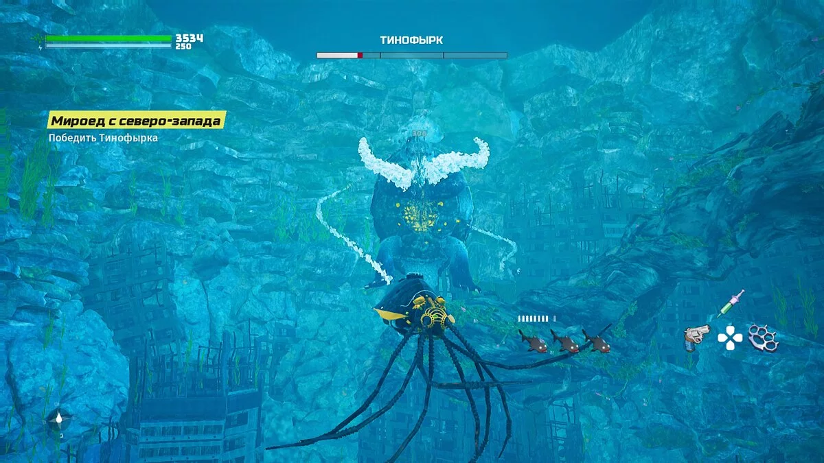 Октопод очень медленный, поэтому уворот от атак босса станет главной проблемой битвы. Вначале монстр атакует двумя вариантами — либо резко сокращает дистанцию и бодает октопод, либо пускает хвостом волну, которая наносит значительный урон. Помните, что вы находитесь в воде, поэтому опускайтесь ниже, либо всплывайте повыше, чтобы избежать опасных ударов.