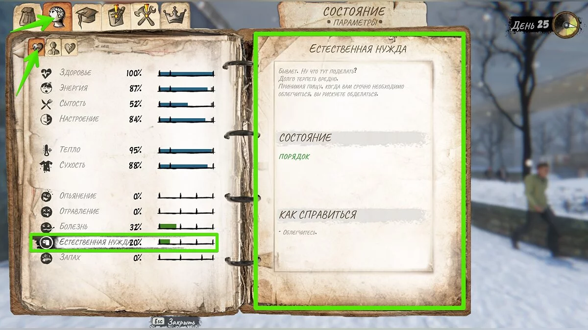 По мере употребления пищи, шкала естественной нужды в разделе «показатели персонажа» будет повышаться. Когда она заполнится на 80% и выше, герой может не выдержать и обделаться прямо в штаны. Это приведёт к ухудшению запаха героя и одежды, а также к снижению настроения вашего персонажа.