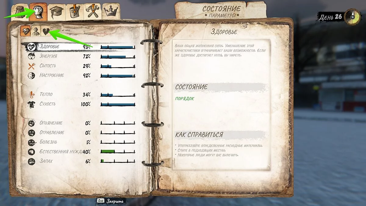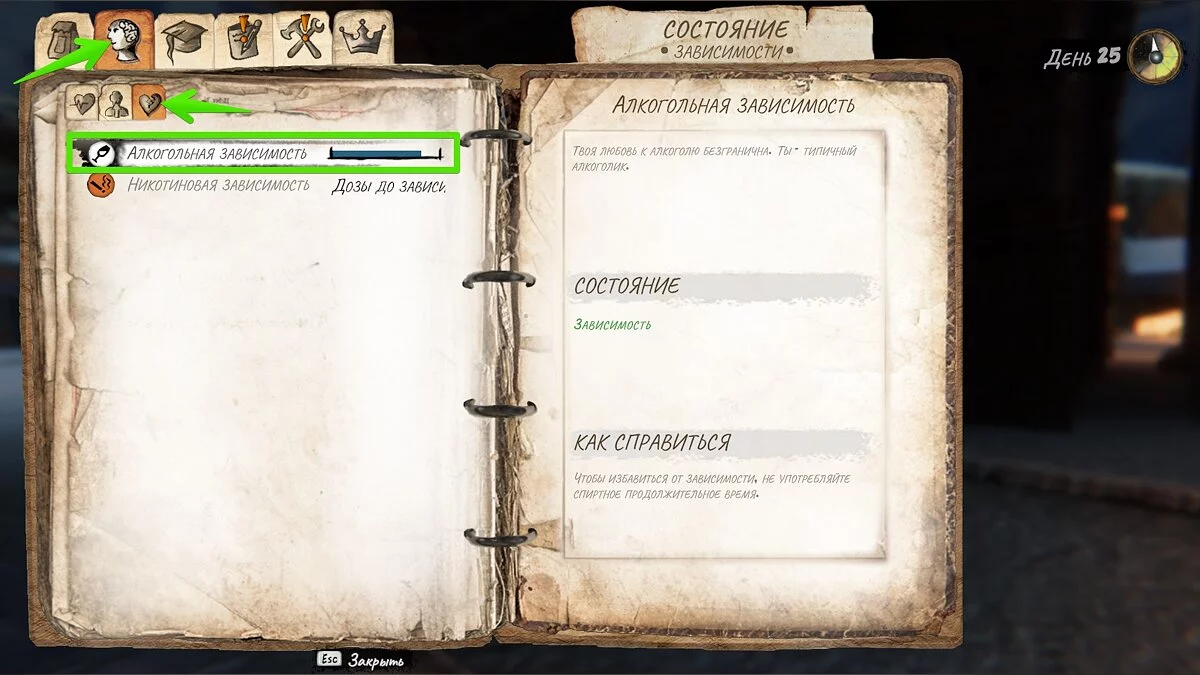 Если это произошло, то вам немедленно стоит прекратить употреблять ту группу веществ, которая может повлиять на появление зависимости. Достаточно всего несколько часов не пить алкоголь или не курить сигареты, чтобы этот значок исчез. Риск зависимости также можно отследить в разделе «Показатели здоровья персонажа» в отдельной вкладке.