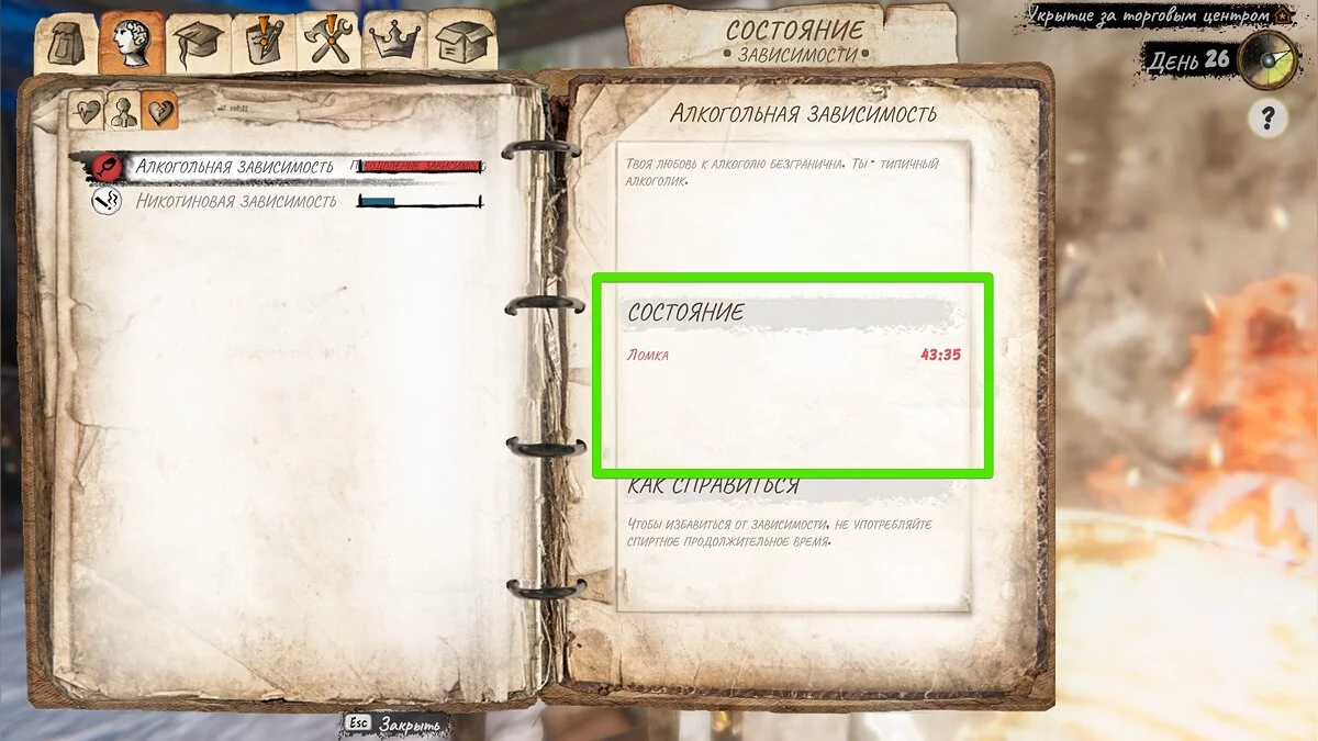В этот же момент, в разделе «Состояние персонажа», вы можете отследить время до полного избавления от зависимости. Время не игровое, а реальное. Чтобы окончательно избавиться от недуга, вам придётся продержаться указанное время без употребления веществ, от которых зависим ваш герой. На первый взгляд это может показаться невозможным, но у нас есть несколько действенных способов, как избавиться от зависимости.