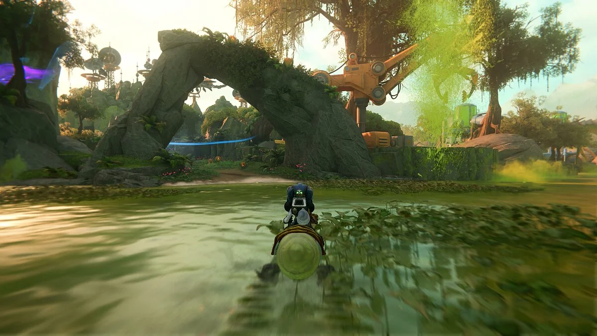 Спускаемся с корабля и замечаем, что на этой планете другая гравитация. Ривет может дольше задерживаться в воздухе. Справа будет синий кристалл, если его ударить, то откроется другое измерение.