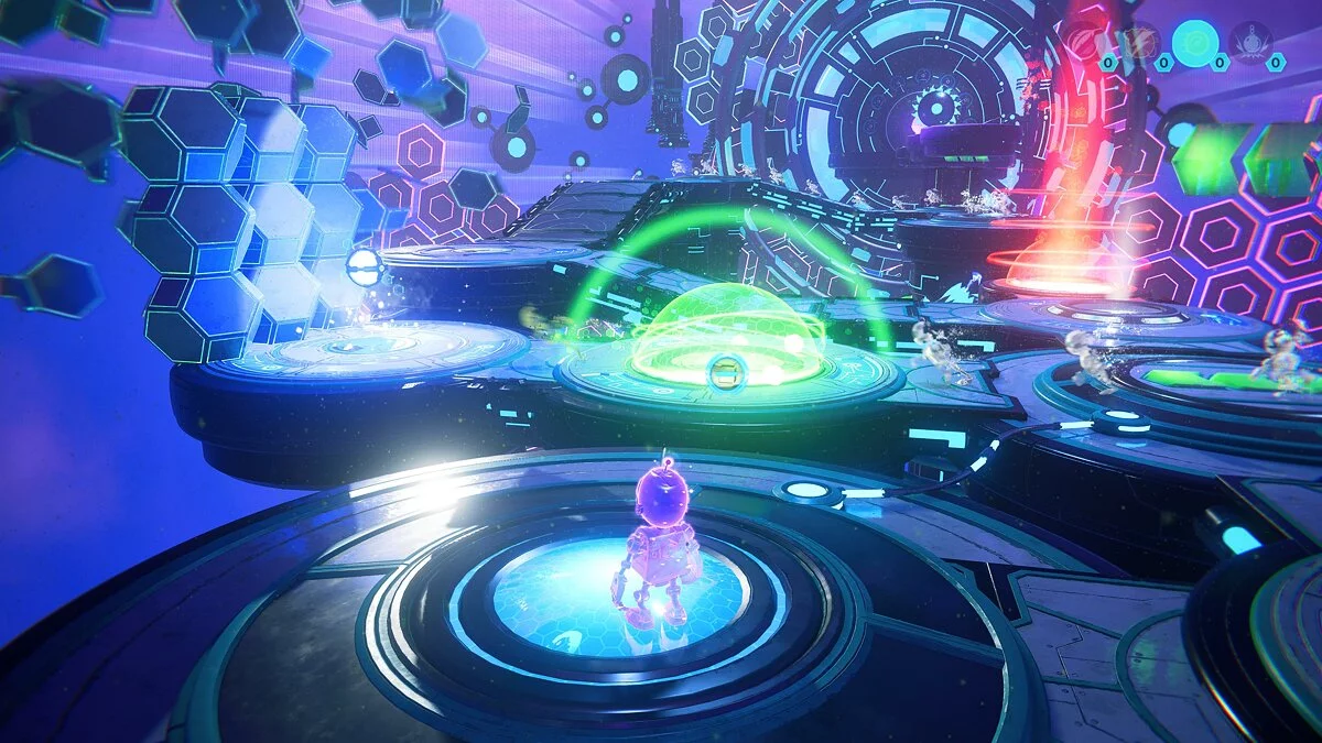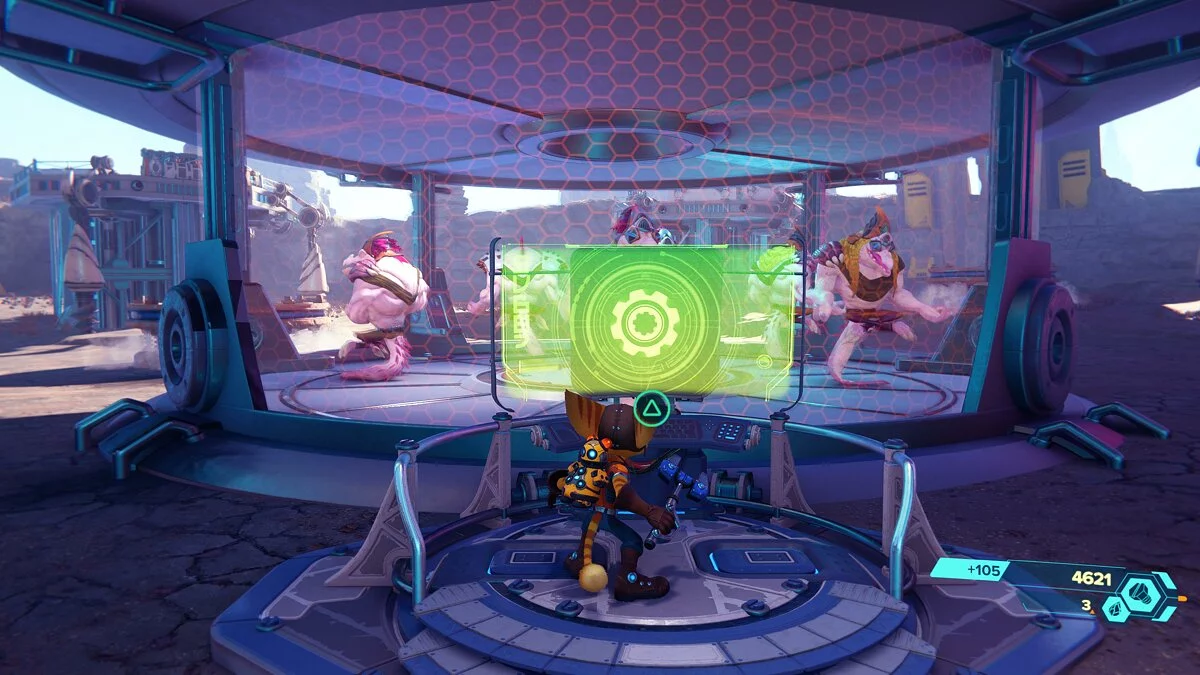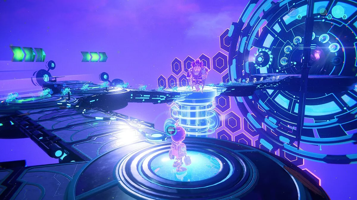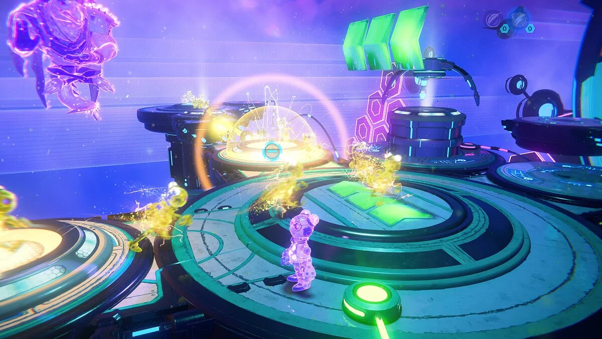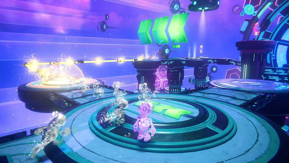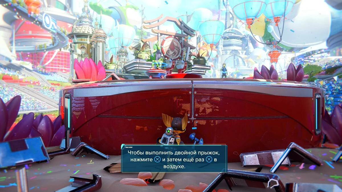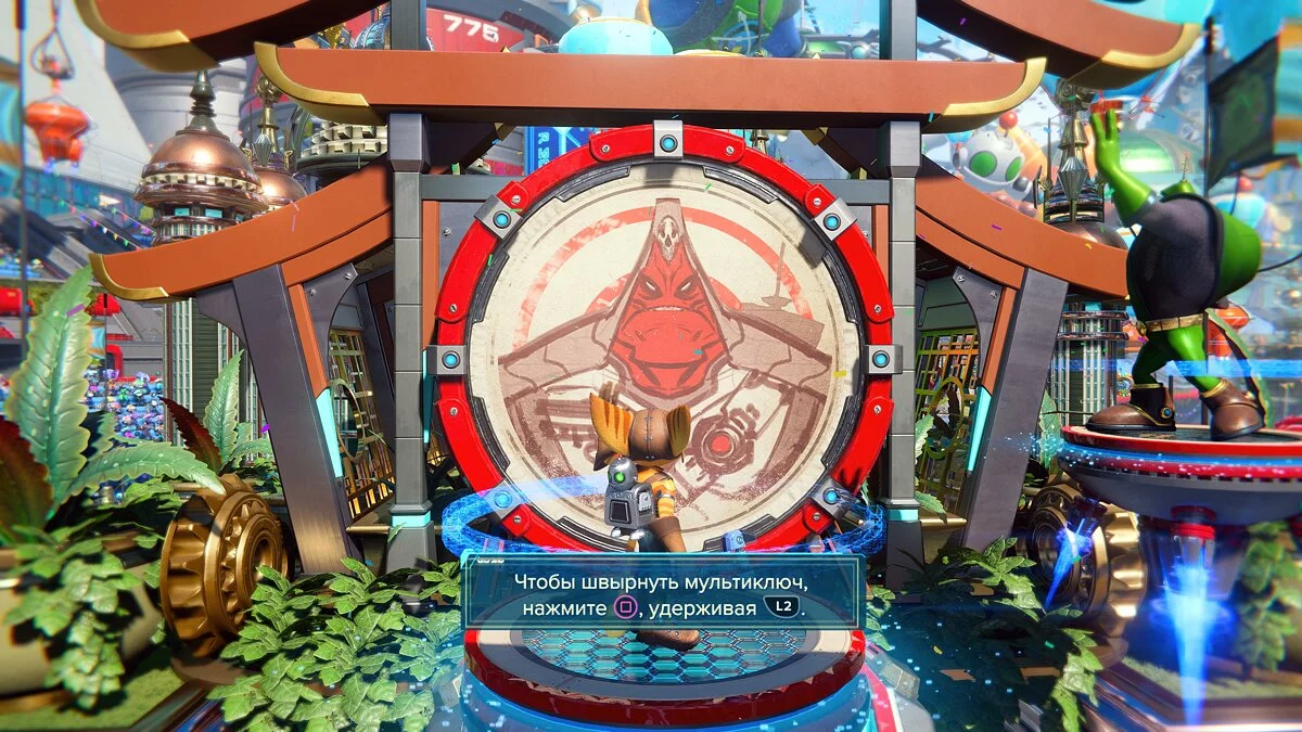 Переключаемся на Рэтчета и Кланка. Проходим к сцене и берём мультиключ. Прыгаем на первую платформу и разбиваем ящики, с них получаем болты. Можно пострелять конфетти из большой зелёной пушки.