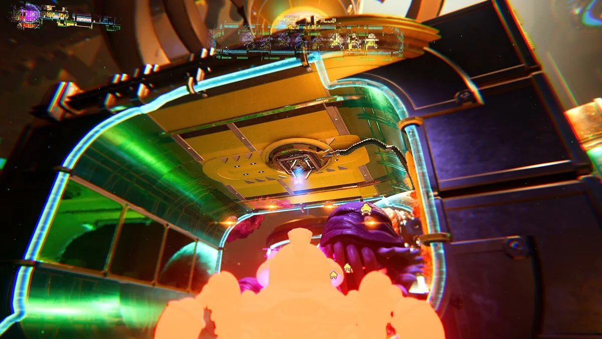 Используем «Глючку», чтобы взломать терминал. Чтобы отключить щит на гнёздах, необходимо встать на кнопку. Их легко заметить по идущим от щита проводам.
