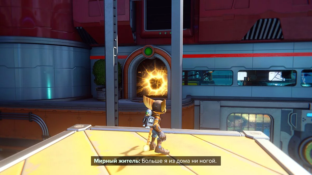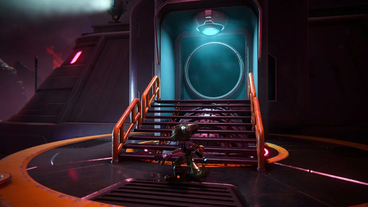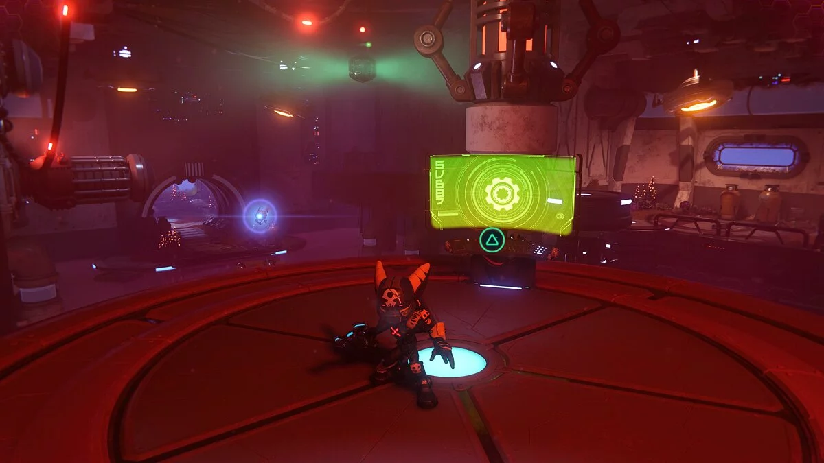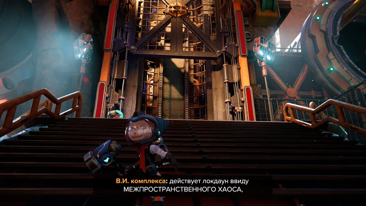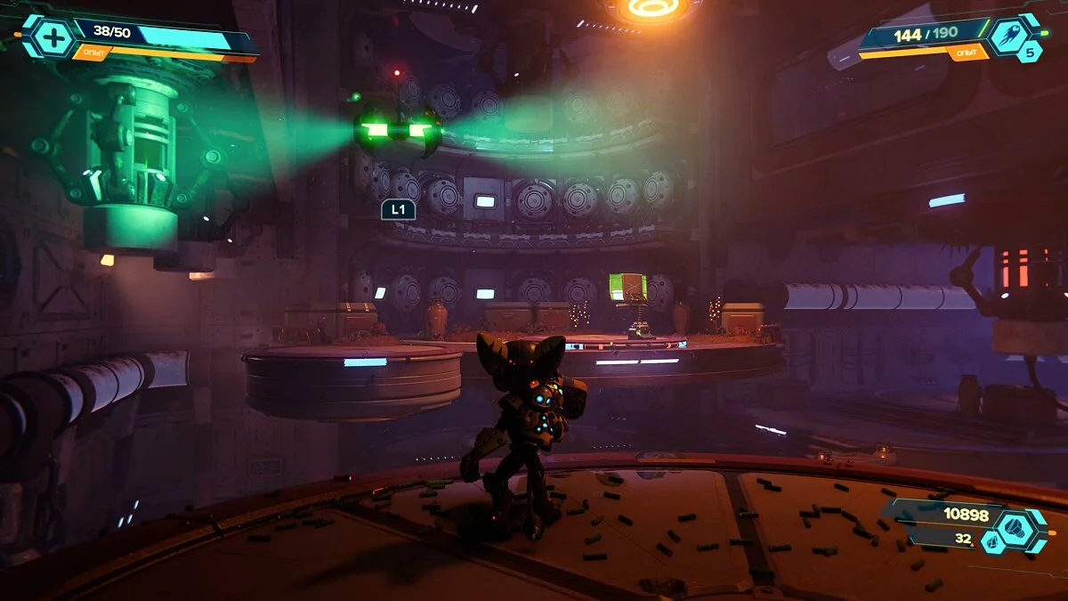 Цепляемся за камеру с Рэтчетом и едем в другую часть карты. Бьём по большой кнопке, чтобы открыть дверь. Из круглой камеры идем влево и доходим до магазина. По платформам прыгаем к кабинету директора.
