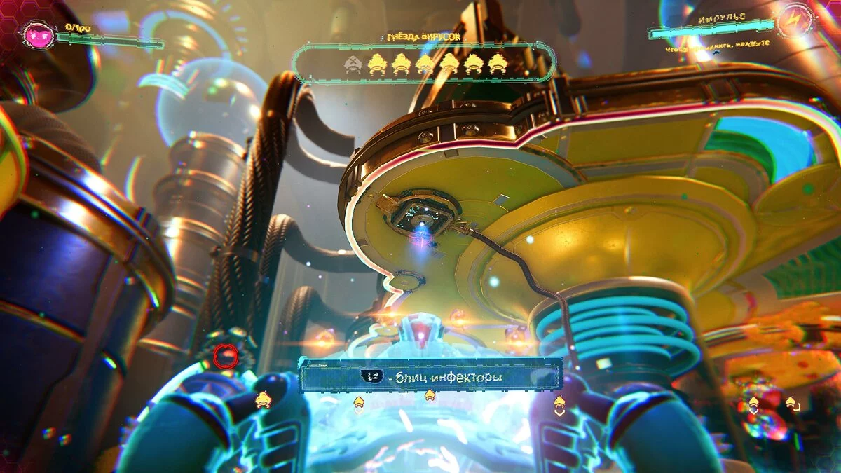Мини-игра, в которой нам нужно управлять «Глючкой» и уничтожать гнёзда вирусов. Стреляем по вирусам и фиолетовым наростам, чтобы пройти дальше. Используем L2, чтобы уничтожить гнёзда залпами ракет.