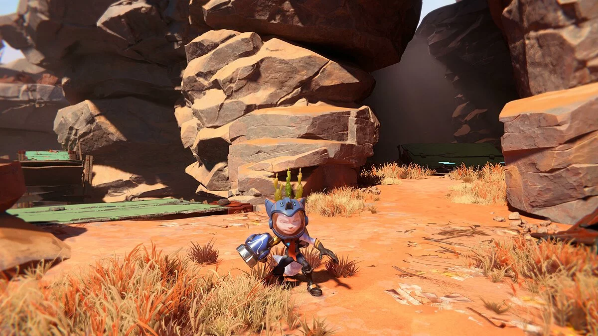В конце пещеры запрыгиваем в разлом. Добегаем до бота-помощника. Бьем по гнезду и запрыгиваем на улитку. На острове справа можно найти шлем. А вокруг полно маленьких островков с ящиками.