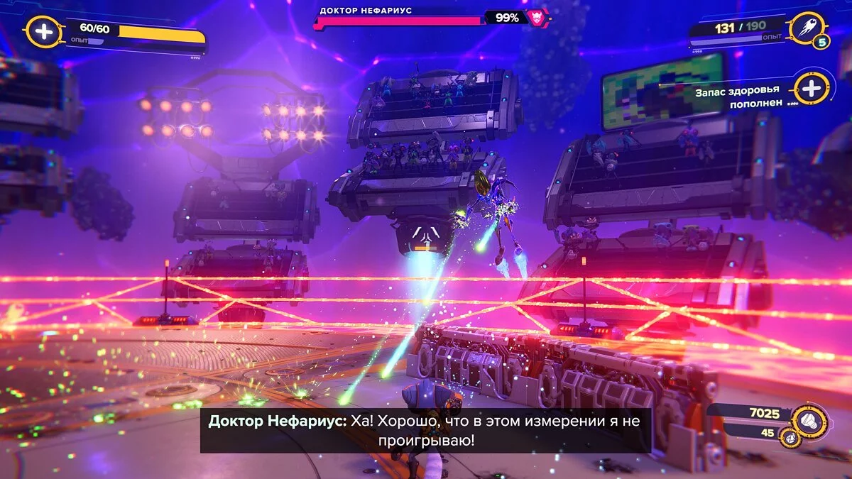 Играем за Ривет. Попадаем на арену и атакуем Нефариуса. Он активно перемещается над площадкой и периодически атакует, зависая в воздухе. Делает резкие рывки, от которых сложно увернуться. Также может бить синим лучом под собой.