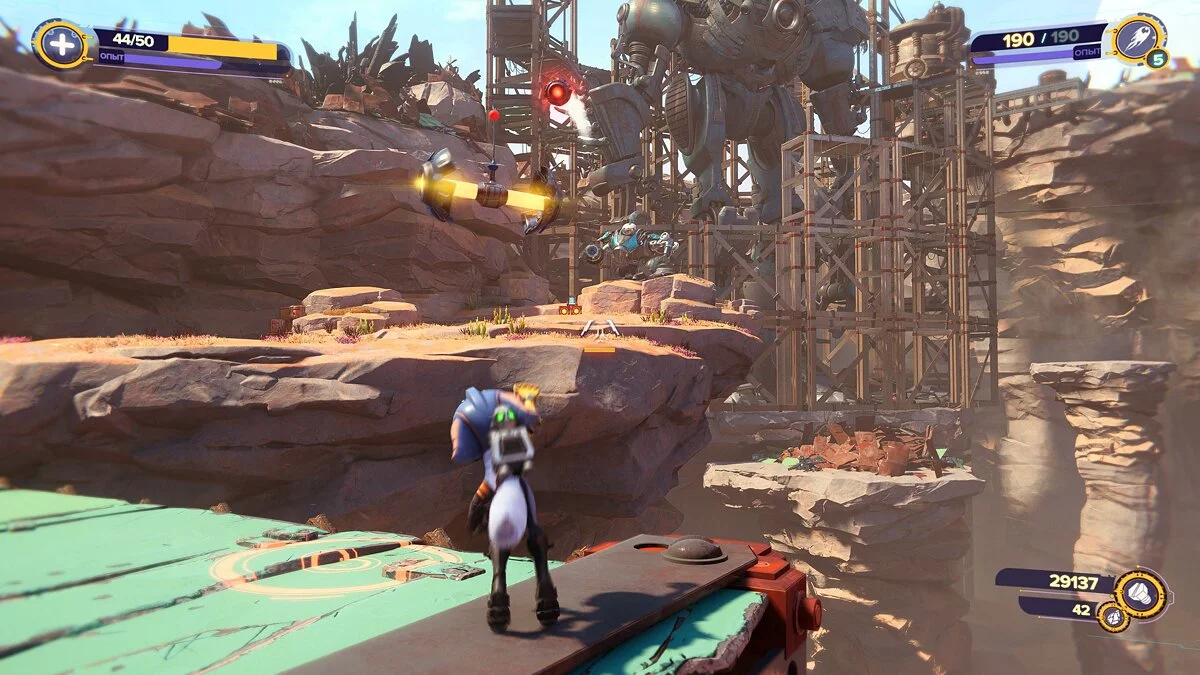 Робот начнёт всё крушить. Прыгаем по рельсам и обходим поезда по беговым стенам. Проезжаем шахту, перескакивая по рельсам и цепляясь за разлом. Робот поймает героев, но Кланк спасёт ситуацию. Робот починит кварц.