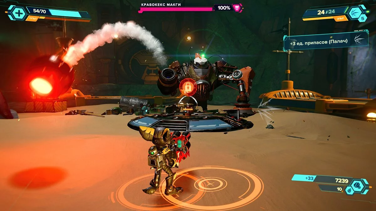 Позже появится босс. Атакуем его и уворачиваемся от выстрелов. Не забываем про обычных громил. При падении корабль сломает кварц, но у Ривет появится идея, как его починить.