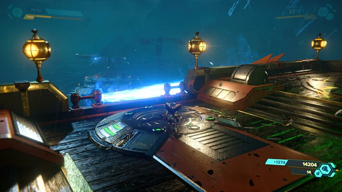 Поворачиваем рычаг и берём награду. Спускаемся на лифте и бежим от щупалец кракена к кораблю. Говорим с капитаном Квантом. Отбиваемся от пиратов и нажимаем кнопку, чтобы запустить корабль. Атакуем пиратов на прилетевших кораблях. Цепляемся за платформу и отключаем «Грабительский луч» на главном.