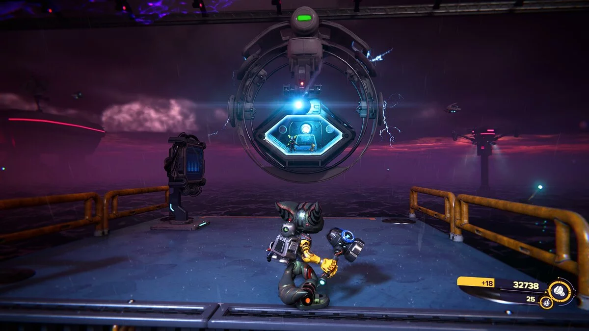 За Рэтчета стреляем в руку, появляющуюся из портала. Не сорвитесь с края платформы, перепрыгивая луч.