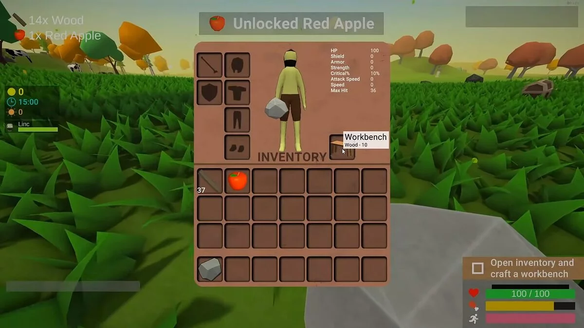 Перед тем, как углубиться в систему крафта и произвести долгожданное оружие, необходимо собрать 10 единиц дерева и установить верстак. Для этого подбираем ближайший камушек (Rock) и добываем нужное количество с самых обычных деревьев. Открываем инвентарь и используем накопленные ресурсы для размещения верстака (Workbench).