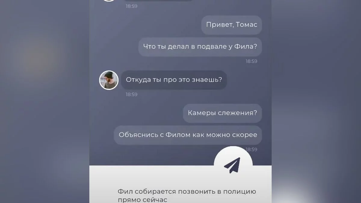 Клео и Томас добавят вас в новый групповой чат и расскажут, зачем они пытались вломиться в подвал бара. Позже к вам присоединится Ричи. В этом чате можете отвечать по своему усмотрению, так как доступные варианты ответов не влияют на сюжет.