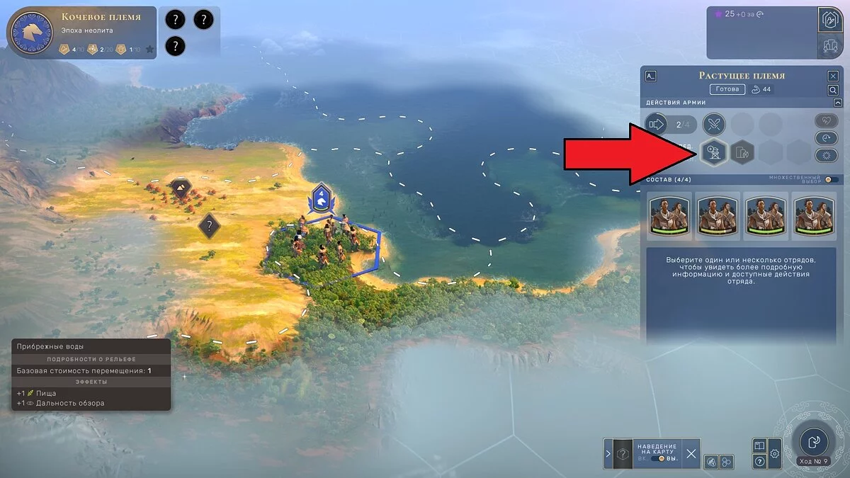 В нашем примере мы получили 5 очков влияния. Куда больше мы раздобыли убив мамонта, но далеко не факт, что этого противника вы забьёте одним отрядом. Возможно, понадобится подкопить еды, чтобы нанять подкрепление. Собрав 10 очков влияния, вы можете построить аванпост, нажав на следующую кнопку: