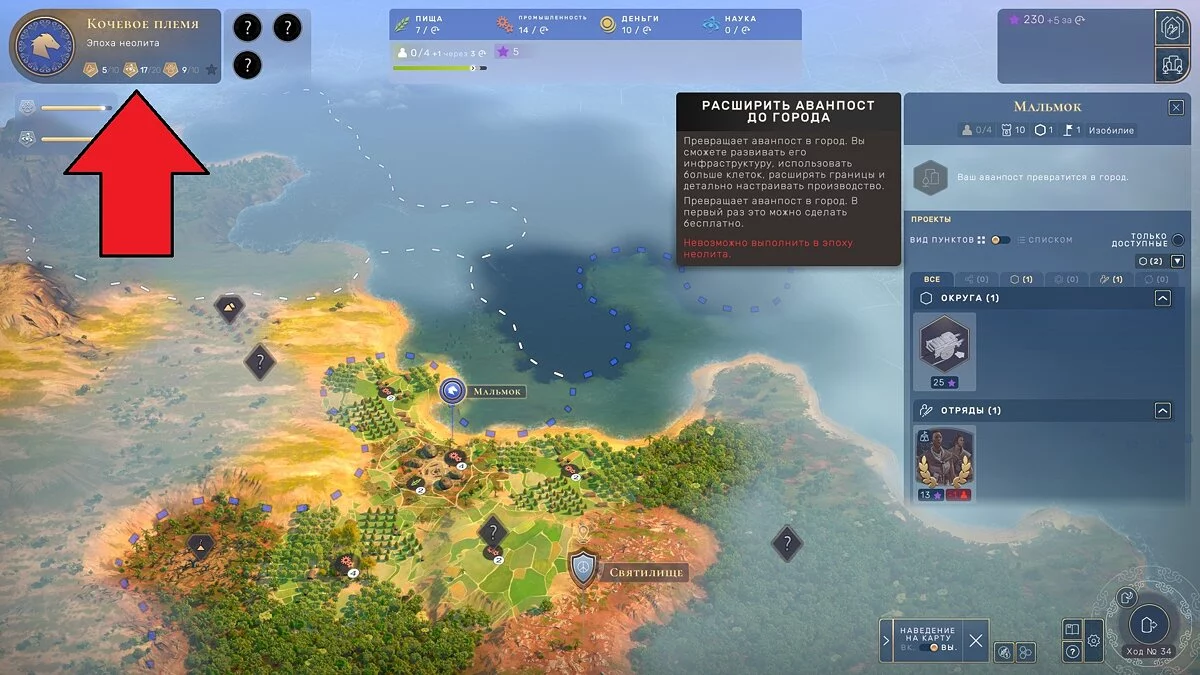 Дело в том, что вы не сможете улучшить аванпост до города, пока находитесь в эпохе Неолита. И чтобы развиться до Древности, необходимо обратить внимание на следующее окошко: