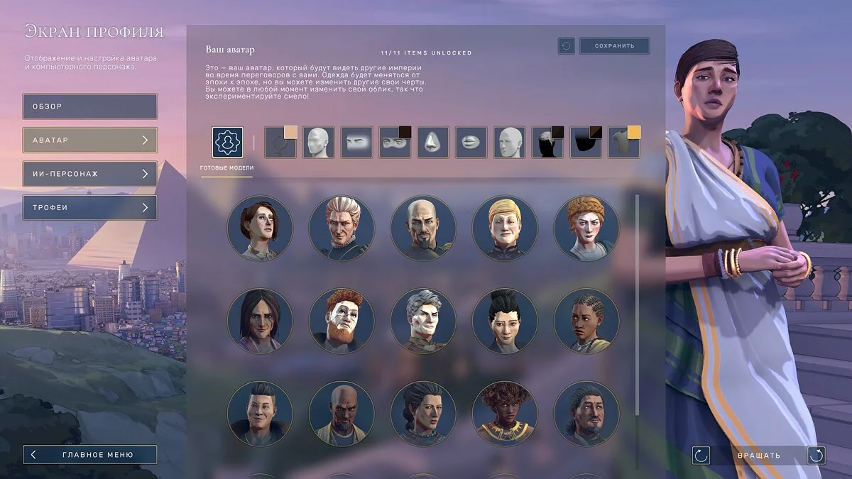 В отличие от той же Civilization, вам не требуется становиться конкретной исторической личностью. Дело в том, что ваш персонаж — не более чем внешний облик, который возможно детально отредактировать. Для этого в главном меню зайдите в «Мой профиль» — «Аватар». После откроется обширный редактор, где и настраивается внешность.