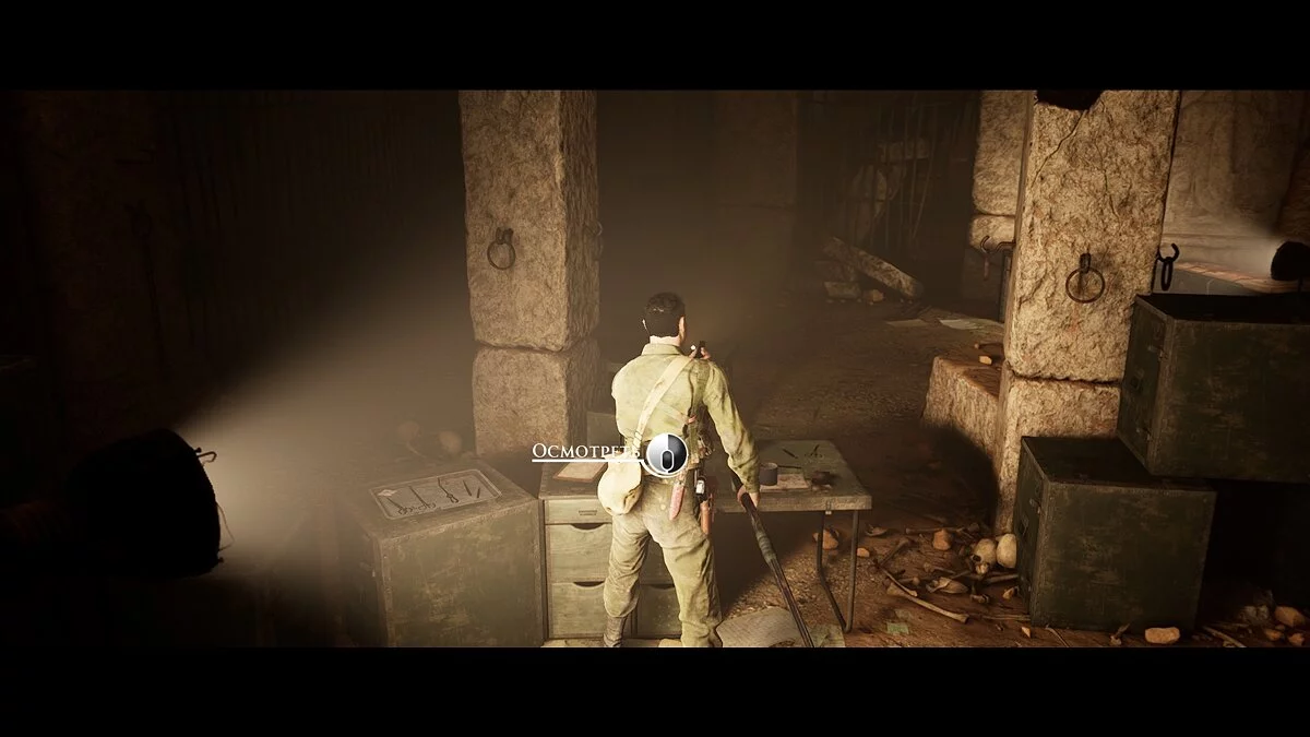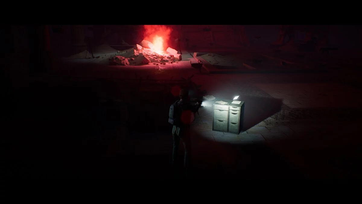 Здесь же на столе изучаем листок с обратной стороны и открываем секрет №20 «Особенности существа». Возвращаемся в большое помещение и в самом центре осматриваем молоток слева от красного ящика. Это действие откроет секрет №44 «Динамит». В центральной части комнаты на столе изучаем обратную сторону записки и открываем коллекционный предмет №32 «Проклятие Аккада». Рядом находим скотч.