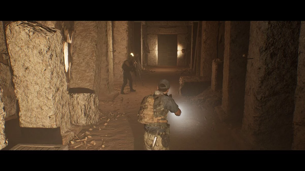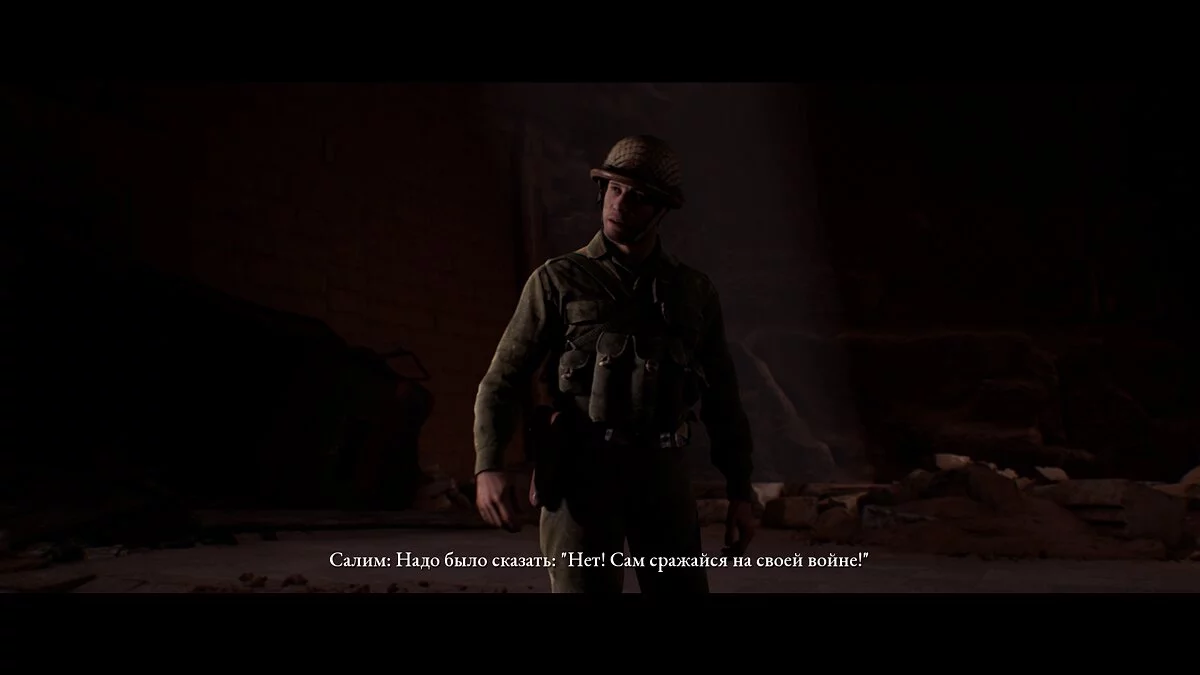 Управление переходит к Салиму. Выбираем любой вариант и сталкиваемся с Джейсоном в тоннеле. Сообщаем ему, что не желаем зла и с энтузиазмом предлагаем сражаться вместе. Этот выбор позволит обоим солдатам стать друзьями. Следуем вперёд. Можем завернуть в тоннель справа и осмотреть черепа и проём. Проходим дальше и открываем дверь.