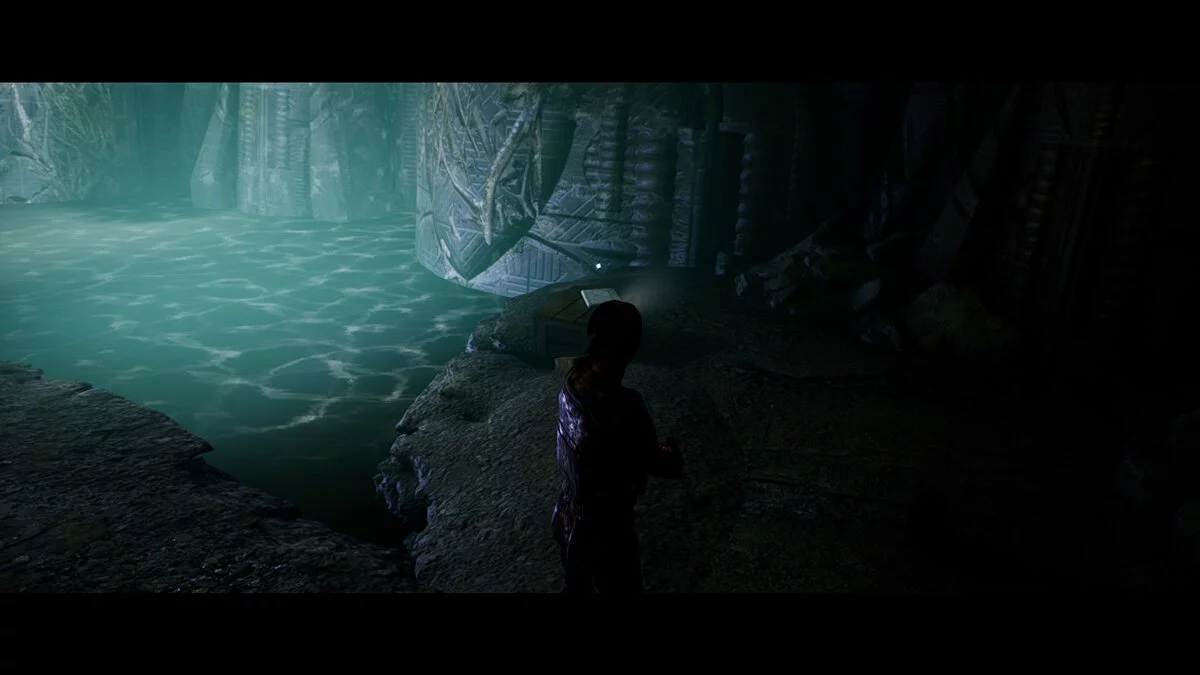 Переносимся к Рейчел. Девушка не пострадала при падении. Идём по левой стороне и находим у берега секрет №11 «Пластиковое удостоверение личности». Избегаем движущиеся объекты под водой и переходим на противоположную сторону. Чуть впереди найдём секрет №48 «Древний шлем». Возле центральной колонны находим секрет №33 «Дневник Рэндольфа часть 5».